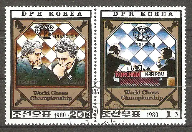 Briefmarke Korea-Nord Mi.Nr. 2074-2075 o Zusammendruck Schachweltmeisterschaften 1980 / WM ’72 Island: Fischer-Spasski & WM ’78 Philippinen: Kortschnoj–Karpow #20251996