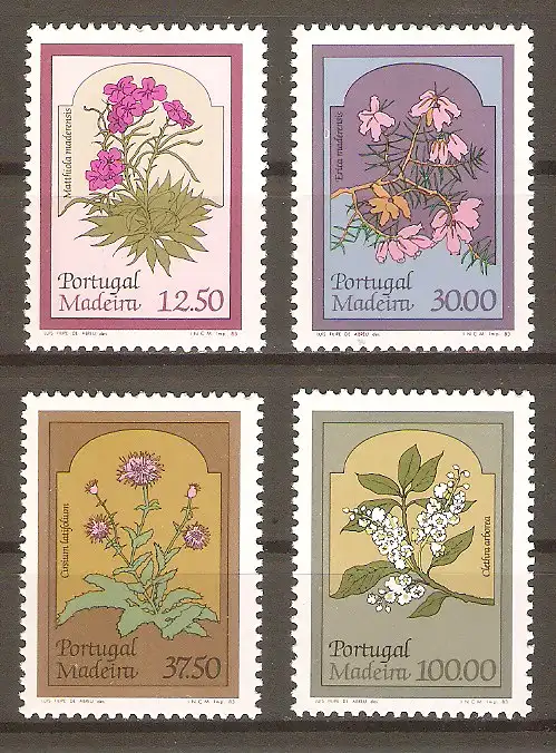 Briefmarke Portugal Madeira Mi.Nr. 86-89 ** Blumen 1983 / Madeira-Levkoje (Mattiola maderensis), Erica maderensis, Cirsium latifolium, Maiglöckchen-Zimterle (Clethra arborea) Kompletter Satz ! #2024971