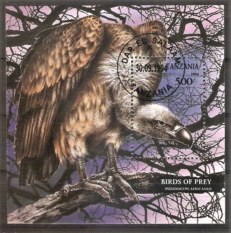 Briefmarke Tanzania Block 260 o (Mi.Nr. 1861) Raubvögel 1994 / Weißrückengeier - Pseudogyps africanus