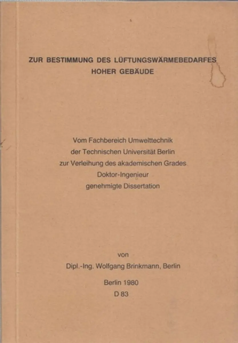 Brinkmann, Wolfgang: Zur Bestimmung des Lüftungswärmebedarfes hoher Gebäude. Vom Fachbereich Umwelttechnik der Technischen Universität Berlin zu Verleihung des akademischen Grades Doktor-Ingenieur genehmigte Dissertation.