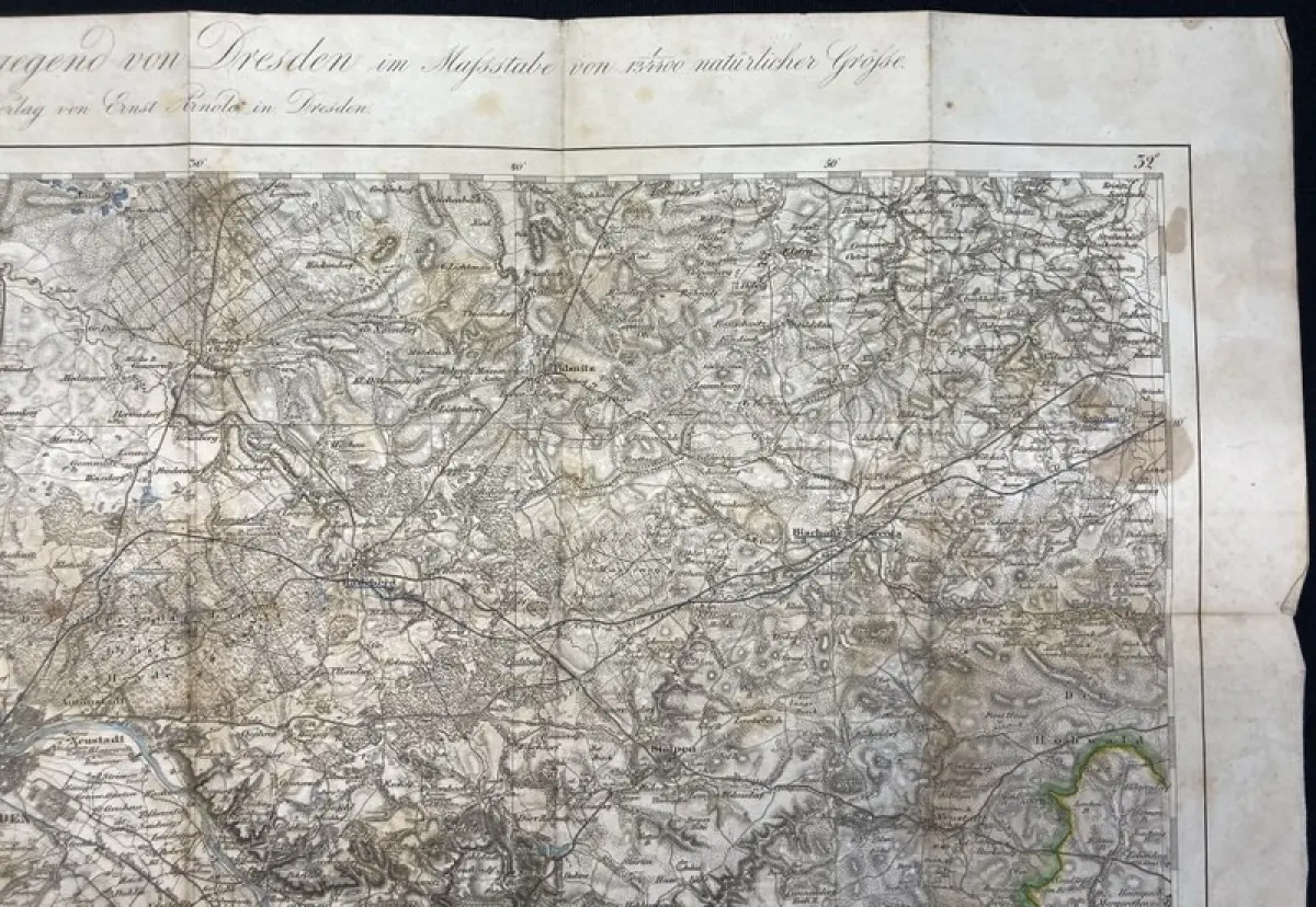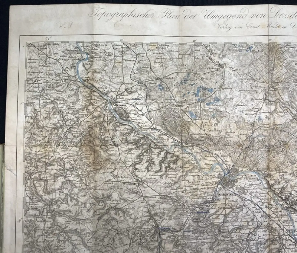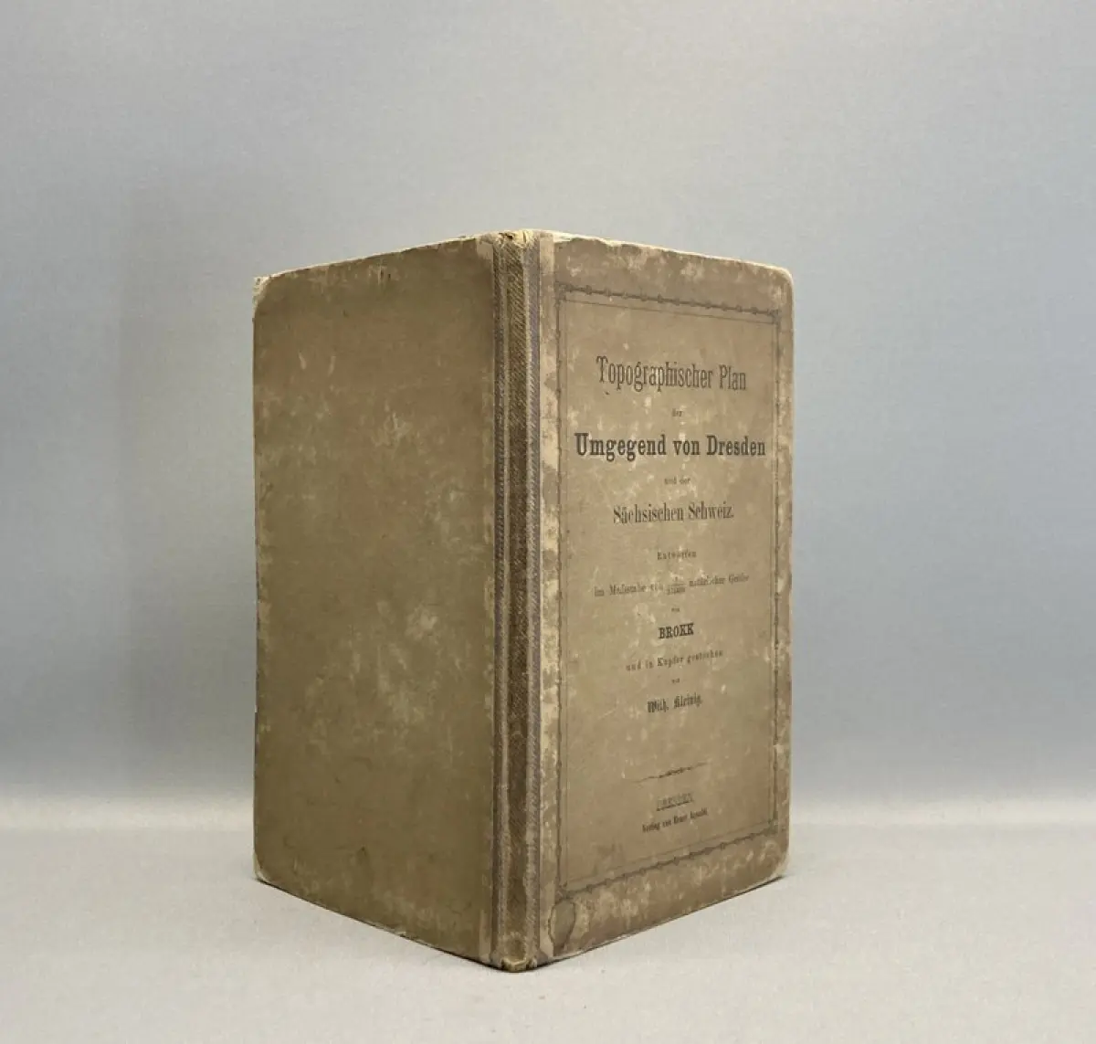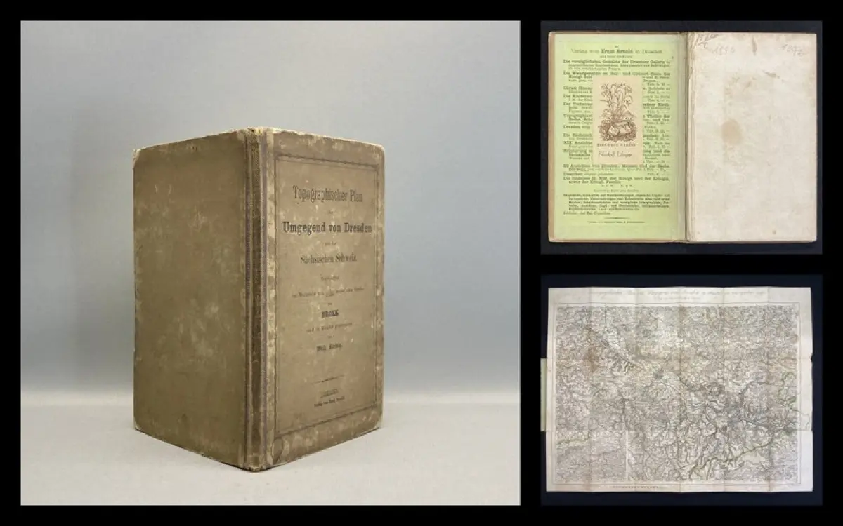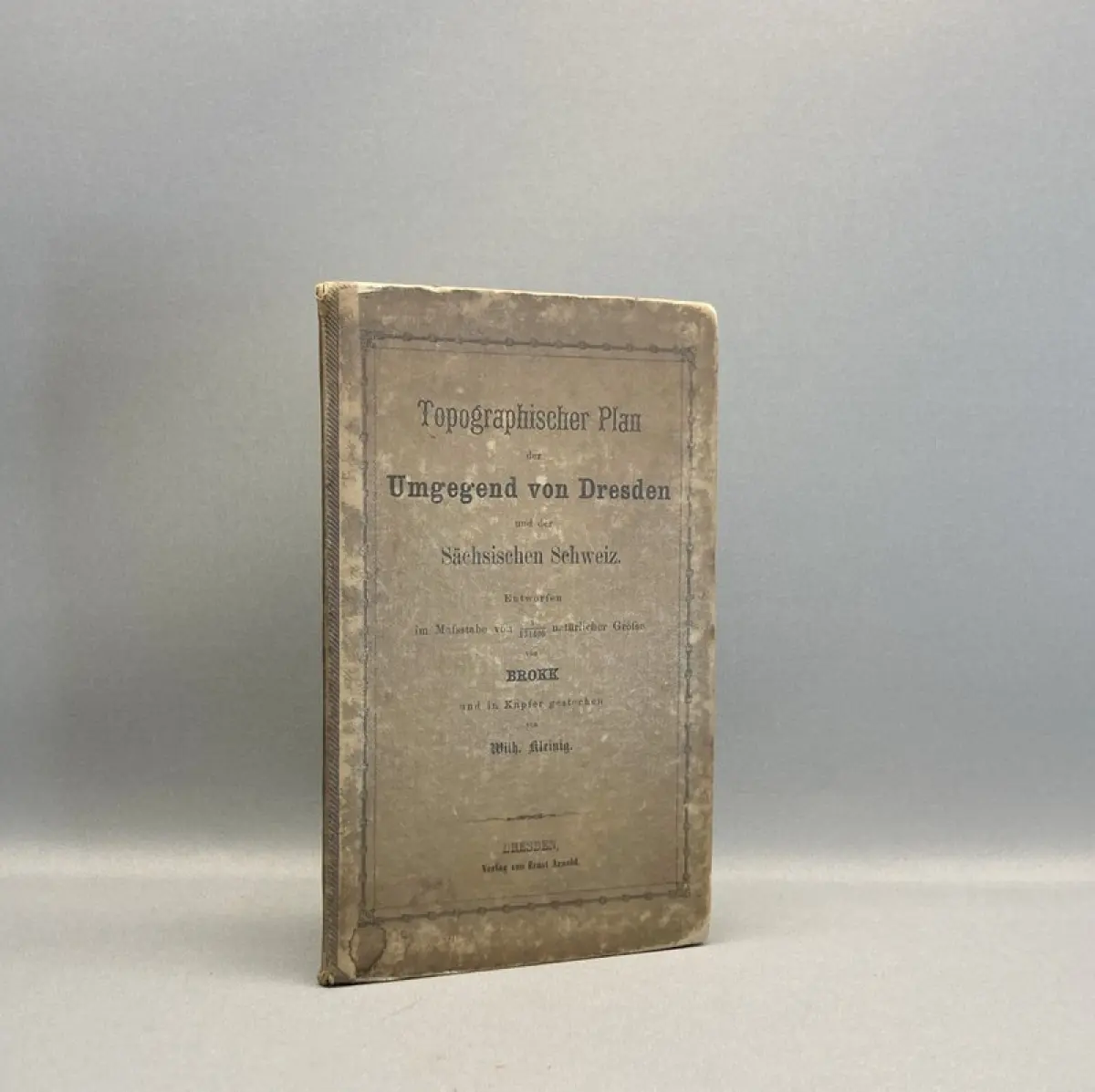 Einband etwas berieben, fleckig und bestoßen. Kapitale etwas ausgefranst. Vorderer Spiegel mit Besitzaufkleber. Karte etwas braunfleckig und knickspurig an den Kanten und Ecken, mit kleinen Einrissen an den Rändern.