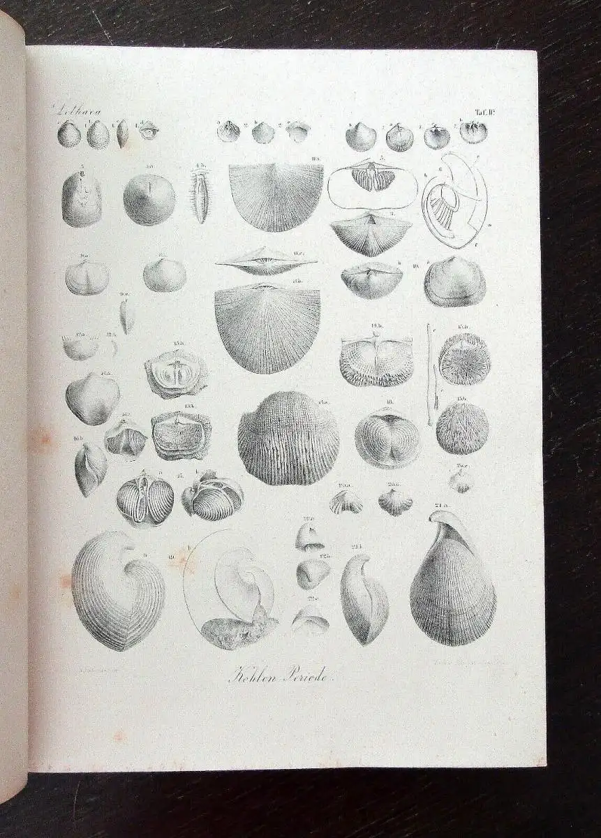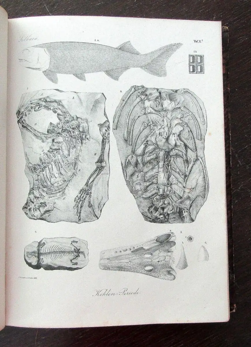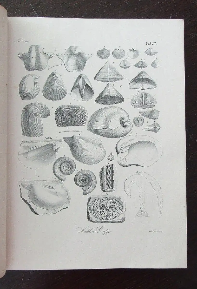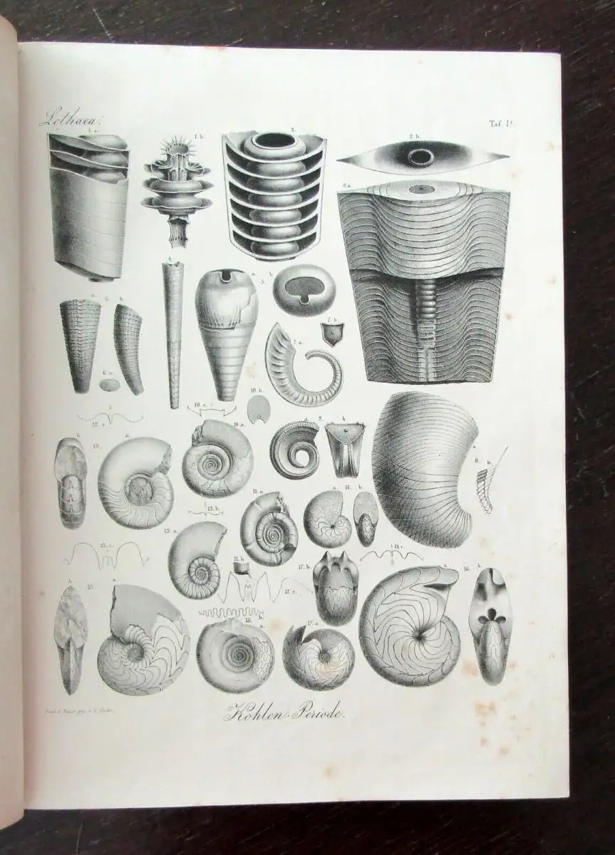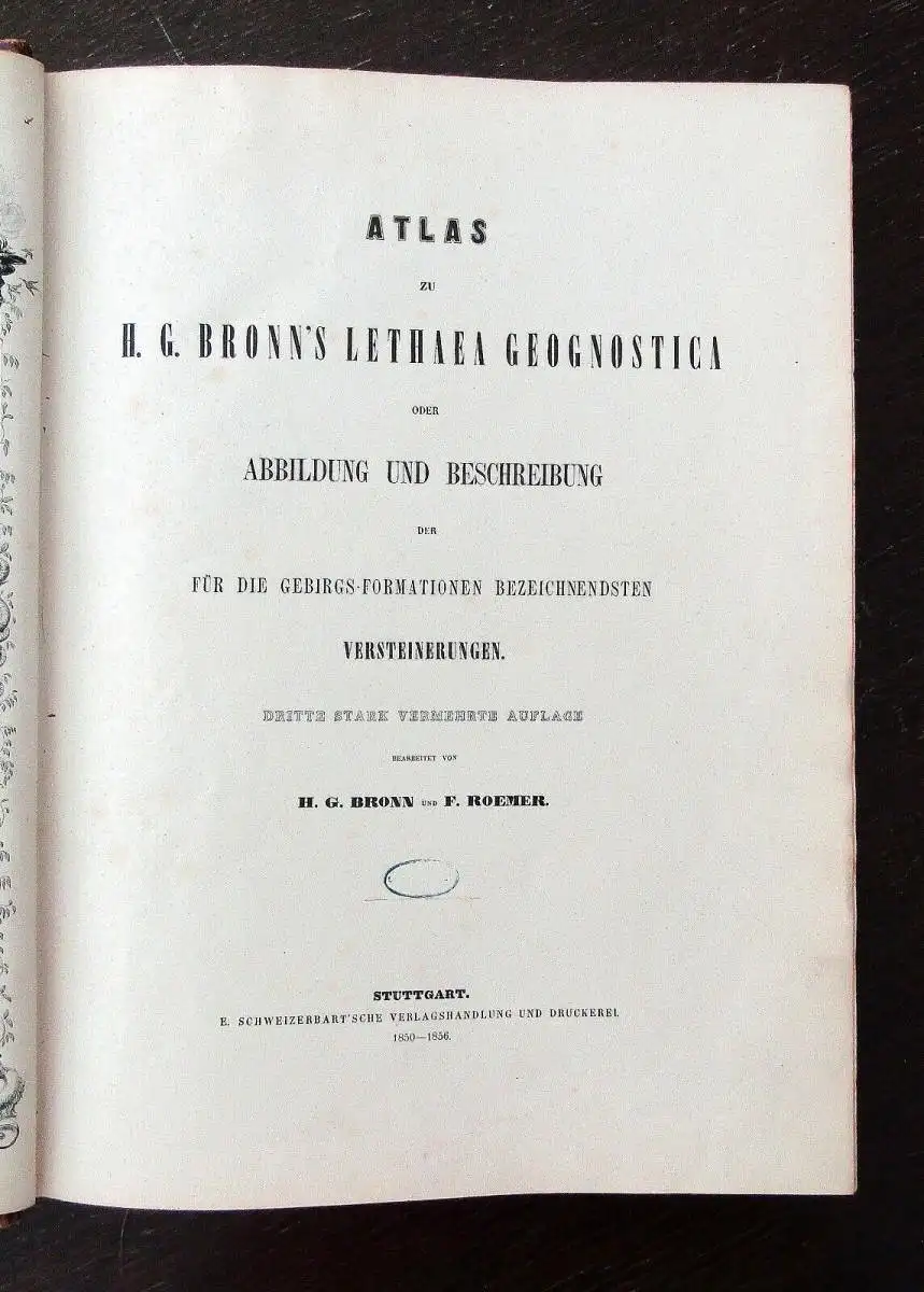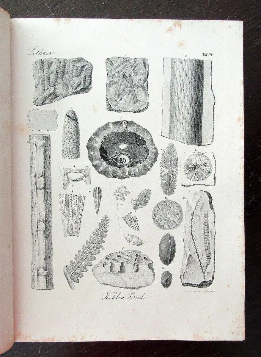 Atlasband zu Bronns berühmtem Werk, das eine "erstmalige chronologische Darstellung der damals bekannten Fossilien" gibt. Dritte stark vermehrte Auflage (im Vergleich zur ersten Auflage um 77 Taf. erweitert).