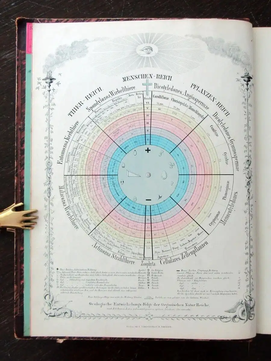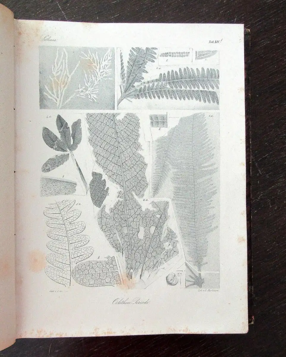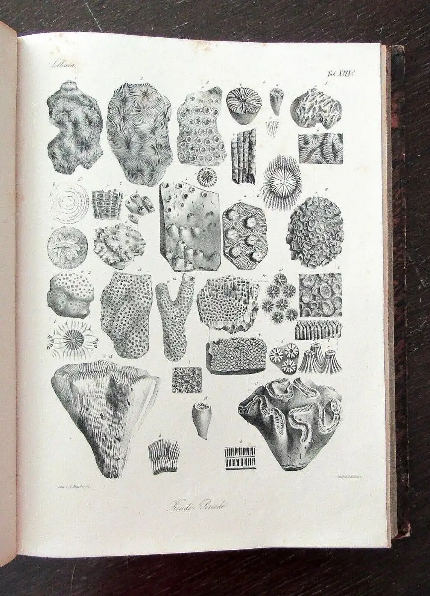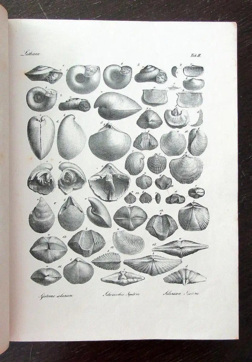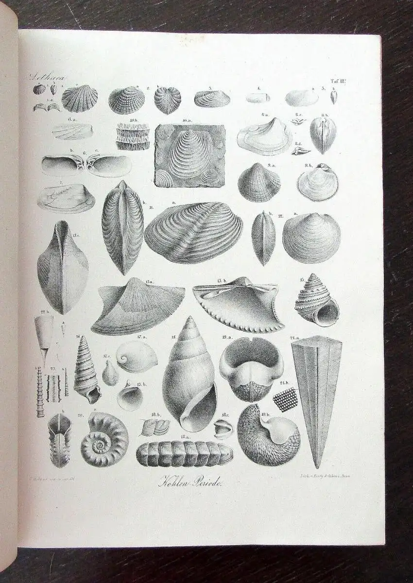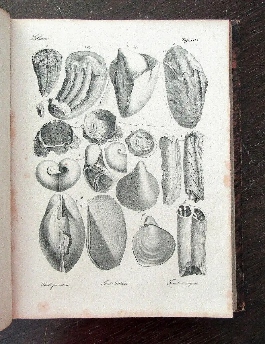 Atlasband zu Bronns berühmtem Werk, das eine "erstmalige chronologische Darstellung der damals bekannten Fossilien" gibt. Dritte stark vermehrte Auflage (im Vergleich zur ersten Auflage um 77 Taf. erweitert).