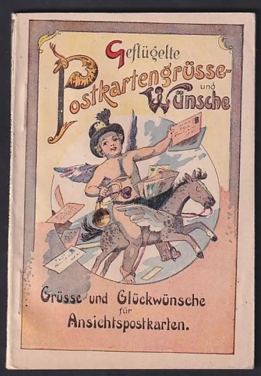 Broschüre 32 Seiten, Geflügelte Postkartengrüsse und -Wünsche, Kleiner Engel mit Posthorn reitet auf einem Pferd