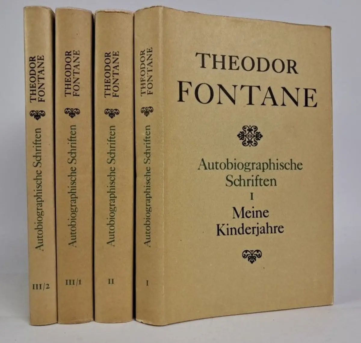 Bemerkungen: Zustand: Schutzumschläge etwas berieben und mit leichten Randläsuren // Mit einigen Faksimiles und umfangreichen Anmerkungsapparat. Herausgegeben von Gotthard Erler, Peter Goldammer, Joachim Krueger, Vorwort von Theodor Fontane. Band I. Meine Kinderjahre. Band II: Von Zwanzig bis Dreißig. Band III/1: C.F. Scherenberg. Tunnel-Protokolle und Jahresberichte. Autobiographische Aufzeichnungen und Dokumente. Band III/2: Anmerkungen. Register.