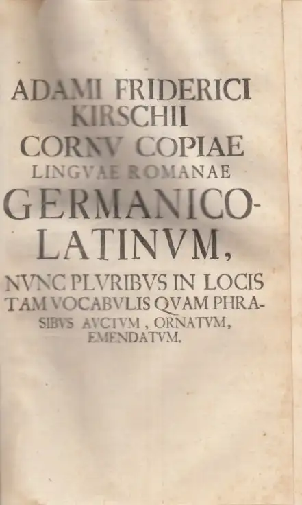 Bemerkungen: Zustand: Nachbindung, Einband etwas berieben, Ecken leicht bestoßen, Titelblatt fehlt, Schnitt angeschmutzt und fleckig, Papierkanten stellenweise fleckig // Adami Frierici Kirschii. 2 Teile. Teil 1: Cornu copiae linguae romanae Nunc Pluribus In Locis Tam Vocabvlis Qvam Phrasibvs Avctvm, Ornatvm (nur Deutsch-Latein). Teil 2: Notarum Romanarum ac Litterarum fingularium Vocumque abbreviatarum Interpretario ex variis actoribus collecta (unpaginiert)