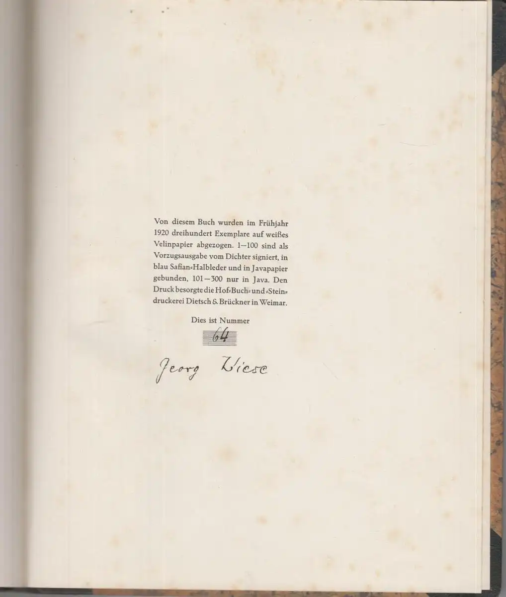 Bemerkungen: Zustand: der Einbandrücken lichtbedingt vom Blauen ins Grüne entfärbt und aufgehellt, der Buchblock etwas stockig und leicht braunfleckig // Druck in einer Antiqua, Exemplar der Vorzugsausgabe mit der Signatur des Autors, Exemplar 64/100, in blau-Saffian-Halbleder und in Javapapier gebunden, Druck von Dietsch & Brückner in Weimar