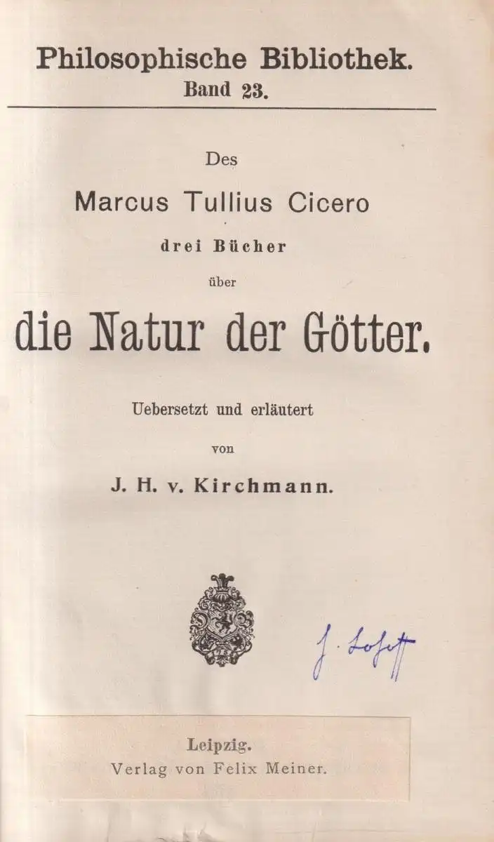 Bemerkungen: Zustand: Einband etwas berieben, Papier gebräunt // Übersetzt von J. H. v. Kirchmann. Philosophische Bibliothek Band 23. Ohne Angabe zum Erscheinungsjahr.