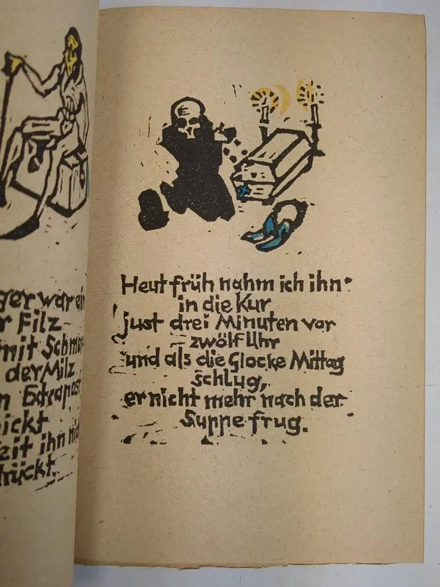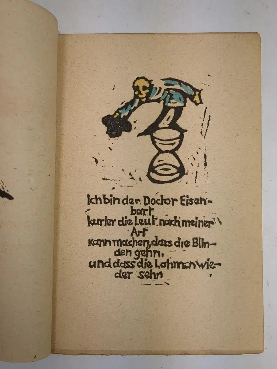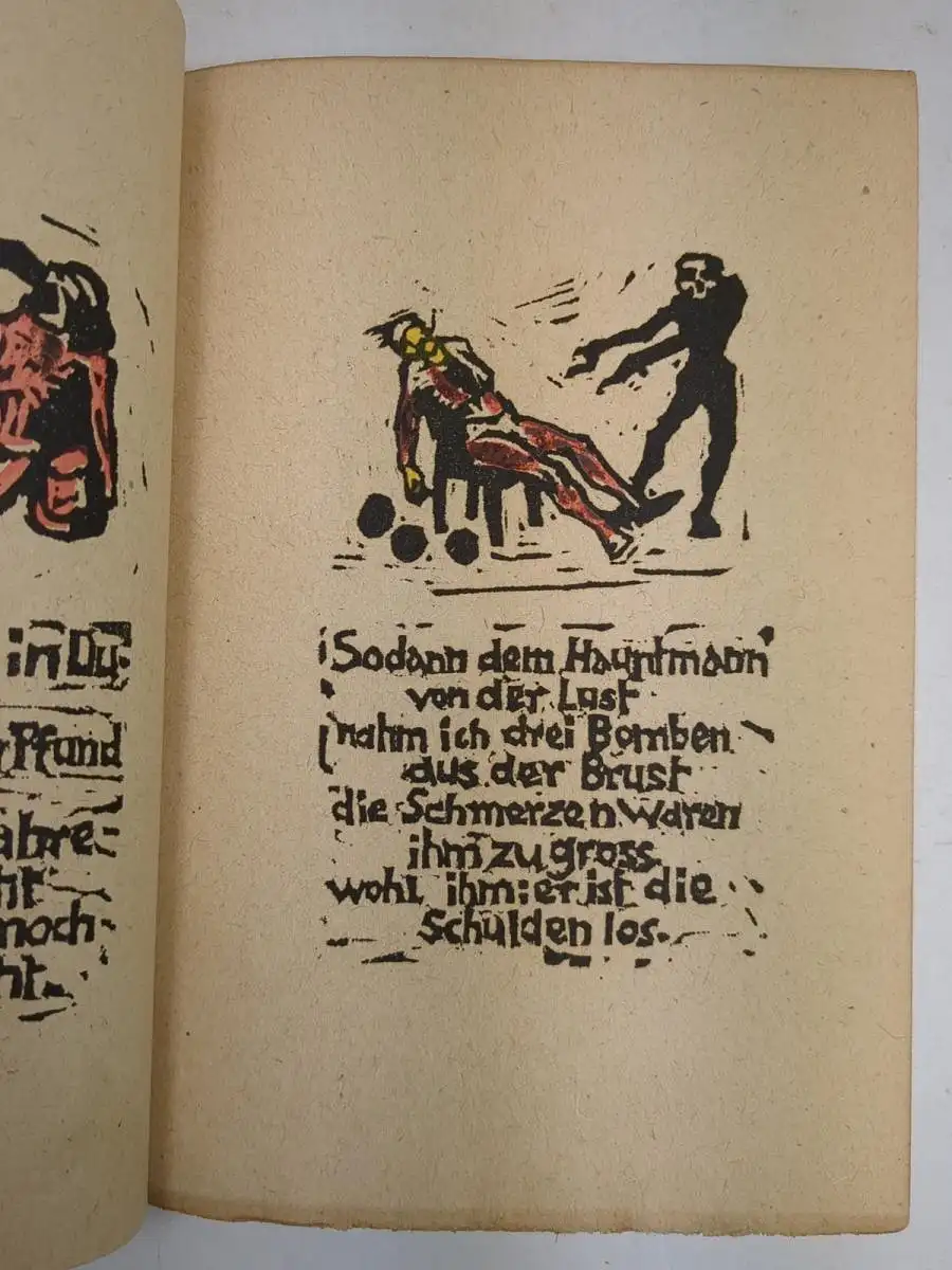 Bemerkungen: Zustand: der Vorderdeckel lose beiliegend, der Hinterdeckel fehlt, Buchblock fest gebunden (Kordelbindung), Druck auf leicht bräunlichem Papier, die Farblinolschnitt wie der Buchblock in gutem Zustand