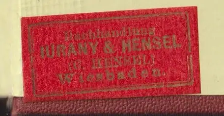 Bemerkungen: Zustand: Einband etwas berieben, Papier minimal gebräunt // Text in Fraktur. Mit Buchhandelsetikett von Iurany & Hensel, Wiesbaden.