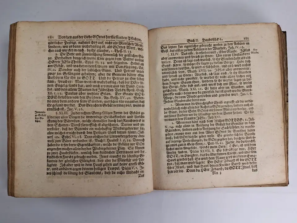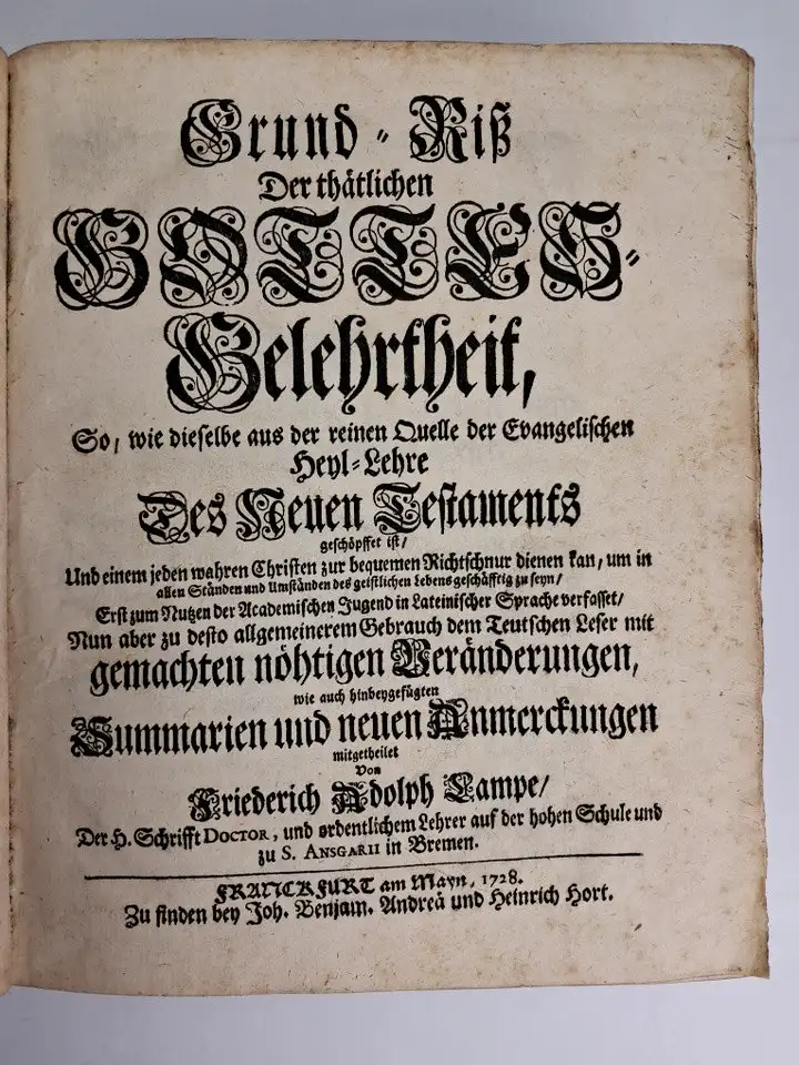 Bemerkungen: Zustand: Einband etwas fleckig, Papier altersbedingt etwas braunfleckig, Besitzeintrag auf dem vorderen Spiegel // Vollständige Titel: "Grund-Riß Der thätlichen Gottes-Gelehrtheit, So, wie dieselbe aus der reinen Quelle der Evangelischen Heyl-Lehre Des Neuen Testaments geschöpffet ist, Und einem jeden wahren Christen zur bequemen Richtschnur dienen kan, um in allen Ständen und Umständen des geistlichen Lebensgeschäfftig zu seyn, Erst zum Nutzen der Academischen Jugend verfasset , Nun aber zu desto allgemeinerem Gebrauch dem Teutschen Leser mit gemachten nöthigen Veränderungen, wie auch hinbeygefügten Summarien und neuen Anmerckungen". Text in Fraktur. Mit Buchhandlungsetikett von Louis Staud, Bad Homburg. Unser Produktfoto entspricht dem hier angebotenen Artikel. Alle Artikel befinden sich stets in gebrauchsfähigem Zustand.