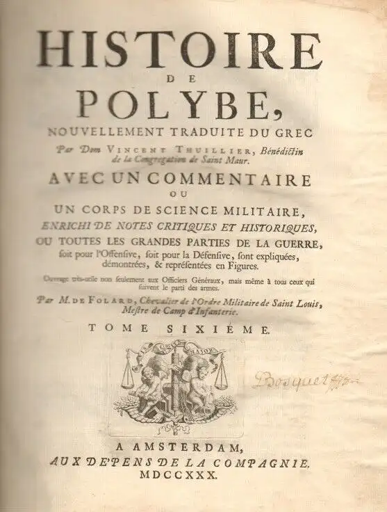 Bemerkungen: Zustand: Der Einband an den Rückenkapitalen berieben, am Fußkapital mit kleiner Bezugsfehlstelle, am Kopfkapital am Falzgelenk zum Vorderdeckel angerissen, die Einbandecken bestoßen, die Vorsätze leicht stockig, der Buchblock in der ersten Lage leicht fingerfleckig, ansonsten sauber, der hintere Spiegel vom Einband halb gelöst, die erste Lage im oberen Eck gering wasserrandig // Mit kleinem Titelkupfer und einem weiteren auf der 1. Textseite, mit zahlreichen Initialen in Holschnitt. - vollständiger Untertitel: Avec un commentaire ou on corps de science militaire, enrichi de notes critiques et historiques, ou toutes les grandes parties de la guerre, foit pour l'Offensive, font expliquées, demontrées, & representées en Figures, Ouvrage tres-utile non seulement aux Officiers Generaux, mais méme à tous ceux qui suivent le parti des armes. Par M. De Folard, Chevalier de lOrdre Militaire de Saint Louis, Mestre de Camp d'Infanterie, Tome Sixieme, a Amsterdam, aux depens de la Compagnie, MDCCXXX, - - Band 6 apart, am Ende Bandes mit einem Leerblatt, mit einer gefa - Übersetzung der berühmten Darstellung von Roms Aufstieg zur Weltmacht, Folard schloss das Werk mit dem 6. Band ab (ursprünglich waren 8 Bände geplant) - die erste Ausgabe dieser Übersetzung erschien in Paris 1727-1730