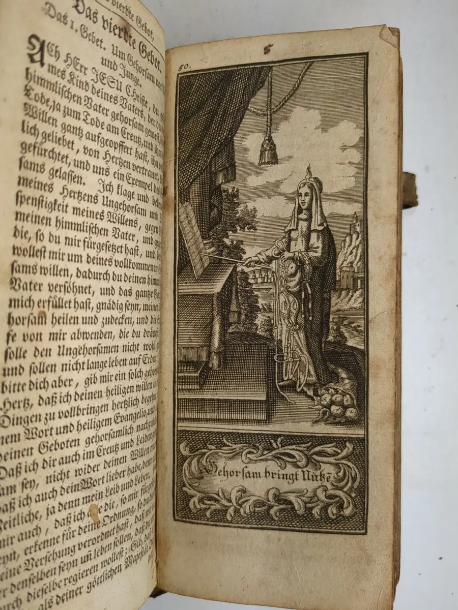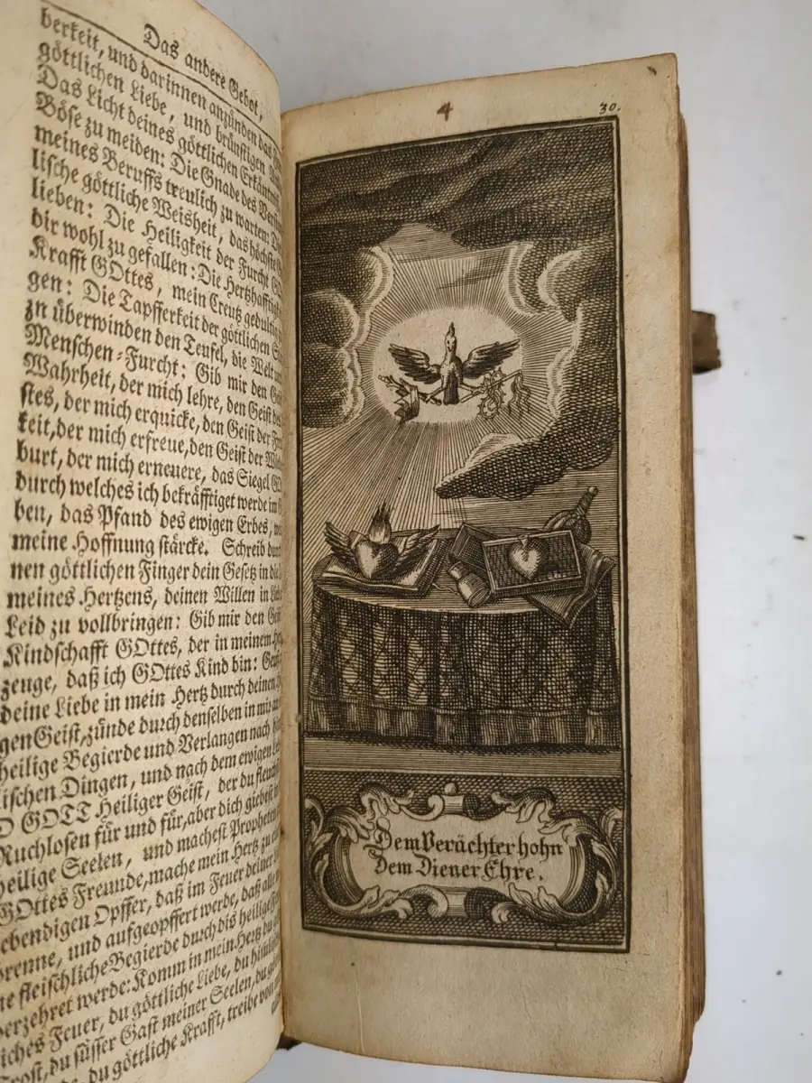 Bemerkungen: Zustand: Einband berieben, Rückdeckel mit winzigen Löchern im Bezug, ohne die Schließen, Schnitt -Vergoldung oxidiert, Titelblatt und weitere Seiten des 1. Titels fehlen, Kupfer vor Seite 1 fast lose, der Buchblock teils im Vorderrand leicht wasserfleckig, ansonsten sauber, das letzte Blatt wieder fast lose und mit Nagespuren, die Vorsätze ebenfalls gebräunt und fleckig, der vordere fliegende Vorsatz fehlt, der hintere und der Spiegel mit Nagespuren // Druck in einer Fraktur. Mit 12 ganzseitigen Kupfern und Vollgoldschnitt. Angebunden: 3 Teile - Neu verfertigtes Gesang-Buch, Darinnen die auserlesensten Alten und Neuen Lieder, Hn. D. Martin Luthers, und anderer gottseligen Männer enthalten, Nebst D. Joh. Habermanns Morgen- und Abend-Gebet, Berlin, Gedruckt und verlegt auff Kosten guter Freunde, 1715, Unterricht von der Heiligung des Siebenden Tages.
