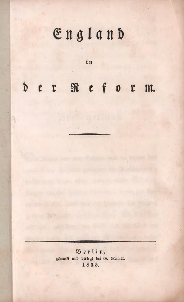 [Bayerische Staasbibl., Signatur: Brit. 648 x.]. - Vorgeschichte und Folgen des britischen Reformgesetzes (Reform Act) von 1832, detailliert von der Auflösung des Ministeriums Wellington 1830 bis zur Auflösung des Reform-Ministeriums unter Premierminister Peel. - Gutes, sauberes Exemplar