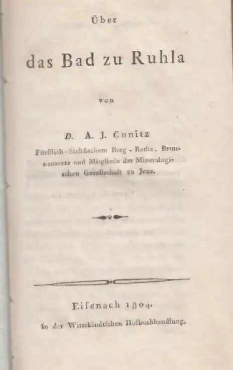 Bemerkungen: Zustand: Der Einband leicht berieben, die Ecken etwas bestoßen und beschabt, beide Vorsätze in den Ecken etwas lederschattig, der Buchblock sauber, - sehr seltenes, frühes Buch zur Balneologie der Ruhlaer Quellen