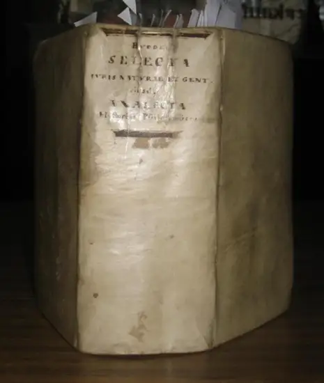 Freie Beschreibung: Kl.-8° ( 16,6 : 10,3 cm). Original-Ganzpergamentband auf fünf durchgezogenen Bünden und mit handschriftlichem Rückentitel. Dreiseitenrotschnitt. Das Pergament mit den natürlichen Farbschwankungen, nur wenig angestaubt und wenigen Verfärbungen (siehe Foto). Heraldisches ExLibris H. A. Eding im vorderen Innendeckel, dort auch eine abgeschabte Stelle. Beide Titel in rot-schwarz gedruckt mit kleiner Titelvignette. Erstes Titelblatt und 2. Blatt mit radiertem, unkenntlichen Stempel. 35, 904, (60) / 32, 463, (29) Seiten mit einigen gestochen Kopf- und Schlussstücken. Einige (schwache) Rotunterstreichungen auf den Einleitungsseiten 19-33, im Hauptteil Seiten 206-476, dann wieder sauber bis zum Ende der Selecta. In den Analecta nur auf ca. 50 Seiten kleine Unterstreichungen. Die Errarata jeweils in alter Tinte dezent diagonal gestrichen, da im Text berichtigt. Sonst sauberes und wohlerhaltenes Exemplar. Fest im Block. Gutes Exemplar der seltenen Erstausgabe