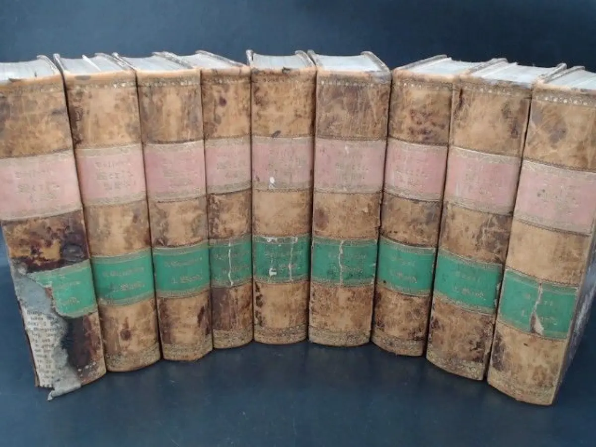Büffon`s sämmtliche Werke, sammt den Ergänzungen, nach der Klassifikation von G. Cuvier. Einzige Ausgabe in deutscher Uebersetzung [Übersetzung] von H. J. Schaltenbrand. 1., 2. 3. und 4. Band: Allgemeine Gegenstände; 5. und 6. Band: Vierfüssige Thiere [Tiere]; 7., 8. und 9. Band: Vögel. Exlibris. Einbände berieben und bestoßen mit Randläsuren. Leder teils etwas brüchig. Band 1 mit Fehlstelle von ca 9 x 2 cm Größe am Rücken. Band 6 und 8: Rückenleder im Gelenk gebrochen. Papier leicht fleckig