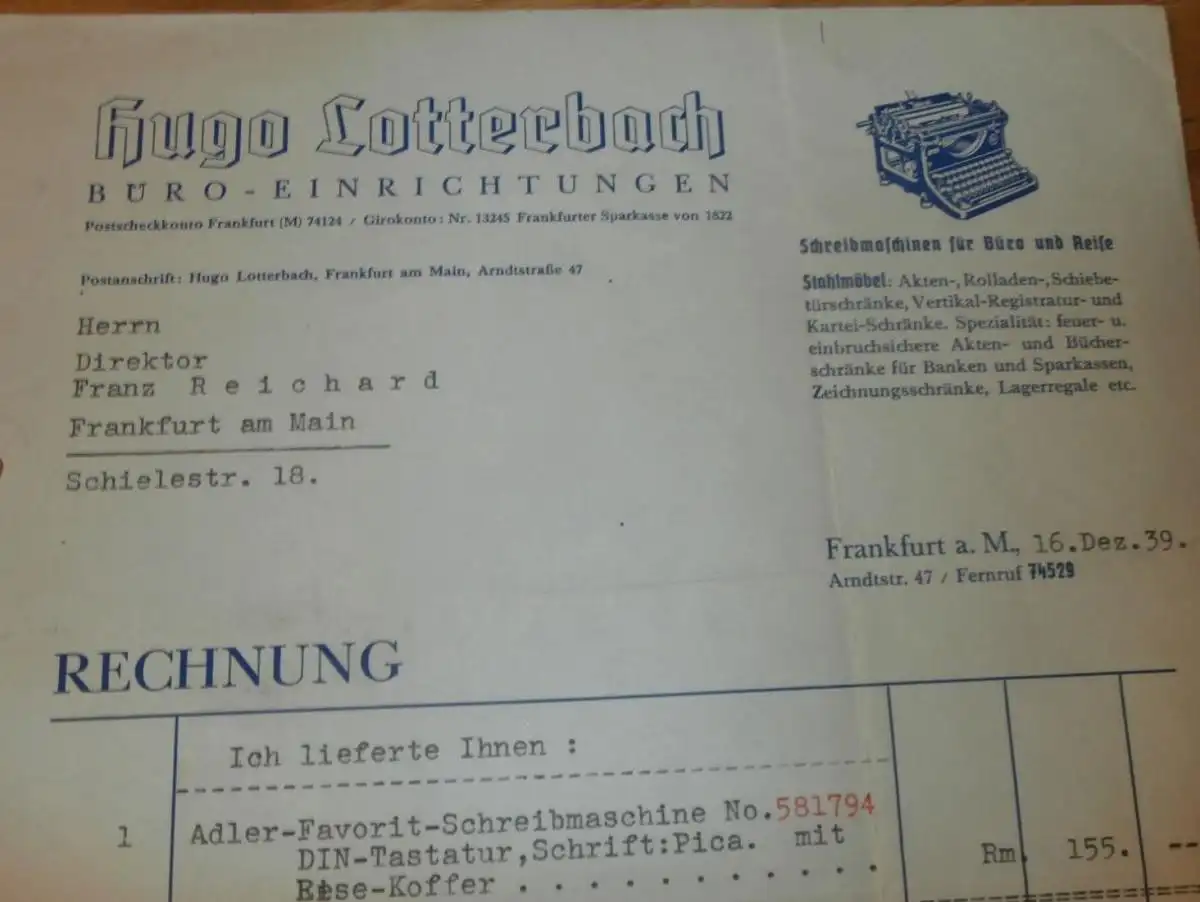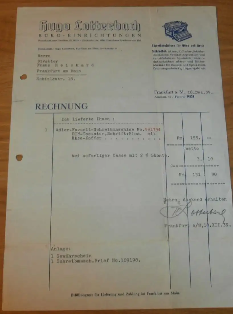 Büro-Einrichtungen - Hugo Lotterbach in Frankfurt a. Main , 1939 , Werbung / Reklame , altes Dokument !!!AZ9-Z