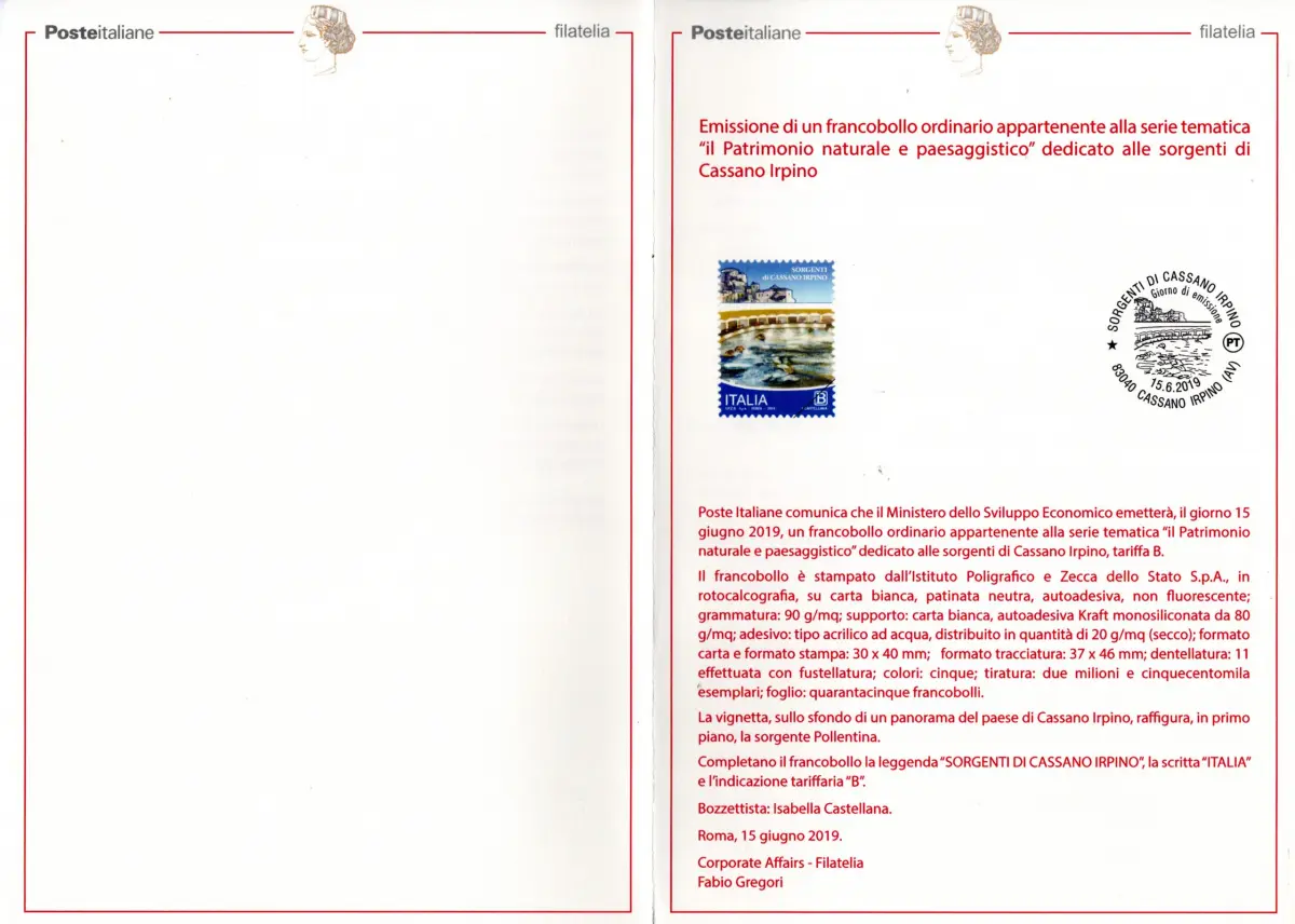Illustratives Bulletin Gratisausgabe - Quellen von Cassano Irpino Illustratives Bulletin der Ausgabe Quellenti di Cassano Irpino vom 15.6.19 - Auf dem Bulletin ist die Ausgabe und die Annullierung auf der Rückseite wiedergegeben KEIN PREIS, NUMMERIERUNG UND BARCODE FÜR DEN VERKAUF - GESCHENKAUSGABE - UNGEWÖHNLICH