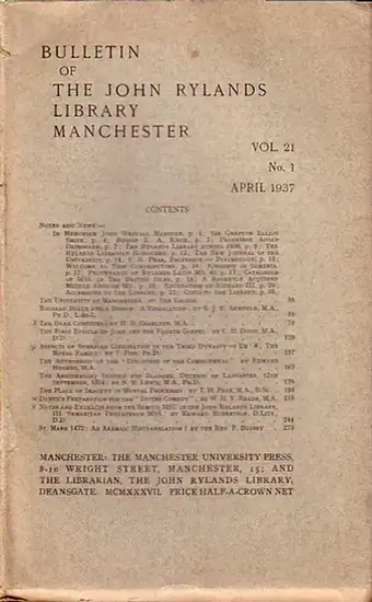 Titel: Bulletin of the John Rylands Library Manchester Vol. 21, N° 1. April 1937. Cont. Essays: The University of Manchester by Henry Guppy / The dark comedies by H. B. Charlton / The first epistle of John an the fourth gospel by C.H. Dodd / Aspects of Sumerian Civilisation during third dynasty of Ur: 6: The royal family by T. Fish / The autorship of the discourse of the commonweal by Edward Hughes / The anniversary service for Blanche, Duchess of Lancaster, 12th September 1374 by N.B. Lewis / The Place of Imagery in mental processes by T. H. Pear / Dante´s preparation for the Divine comedy by W.H.V. Reade / Notes and extracts from the semitic MSS III: Samaritan Pentateuch MSS by Edward Robertson / St. Mark 1472: An aramaic Mistranslation? by F. Bussby