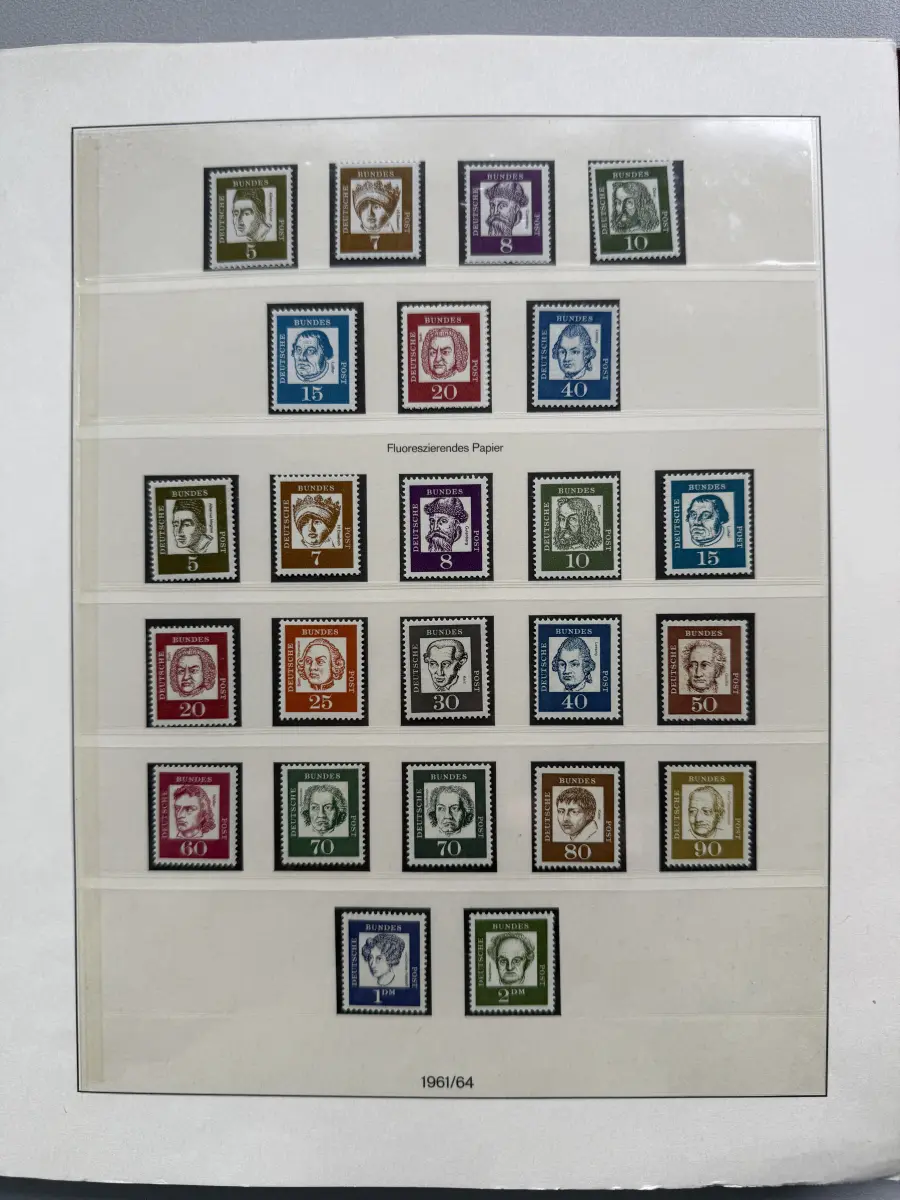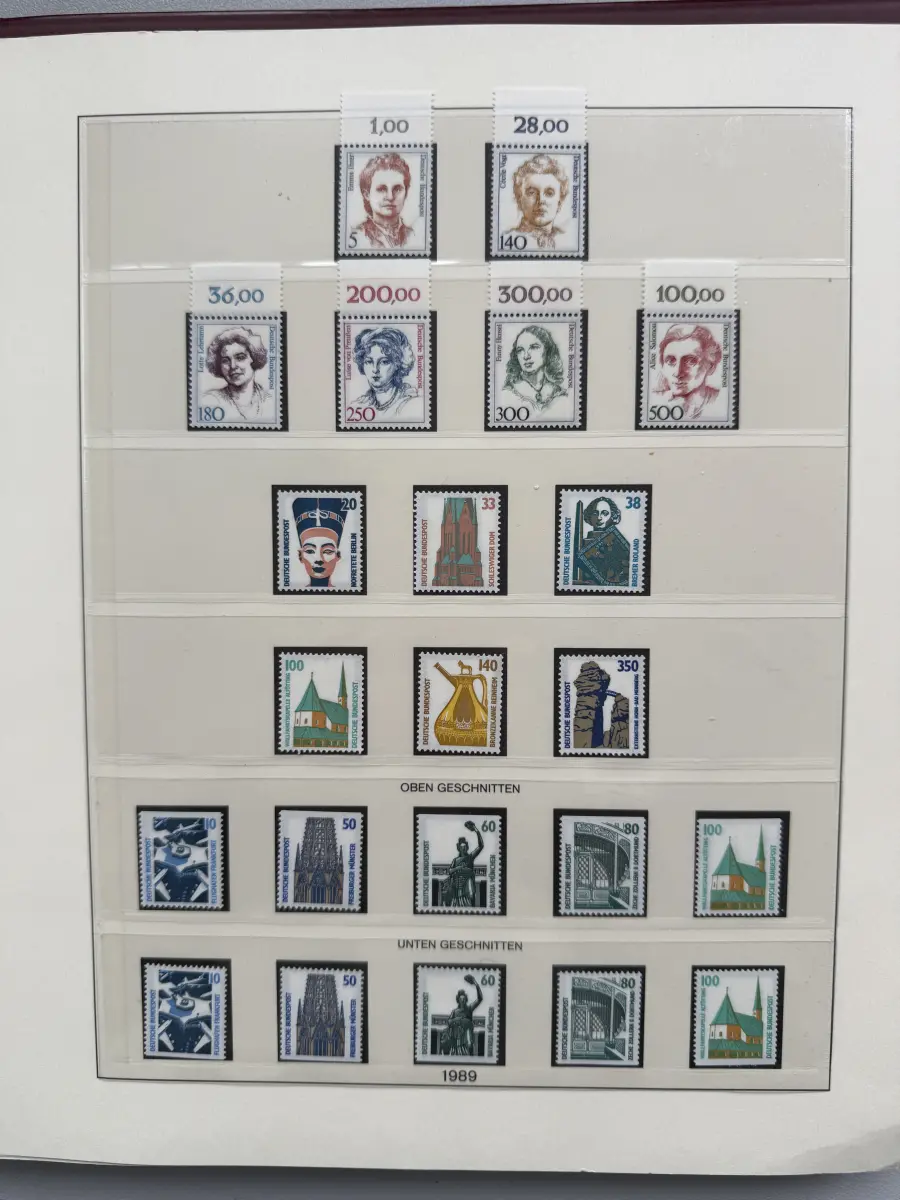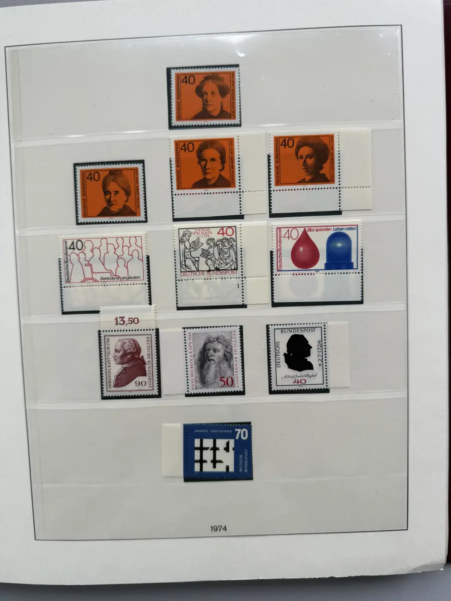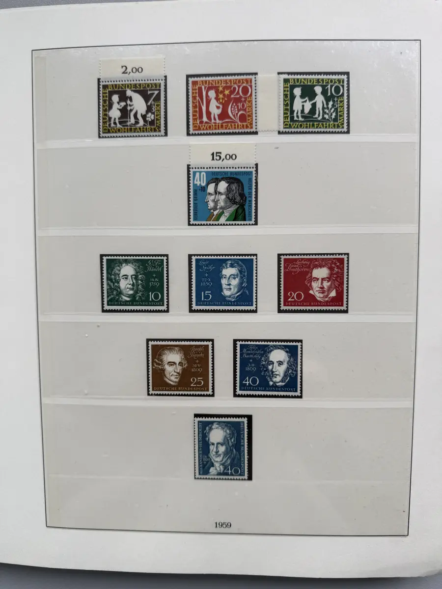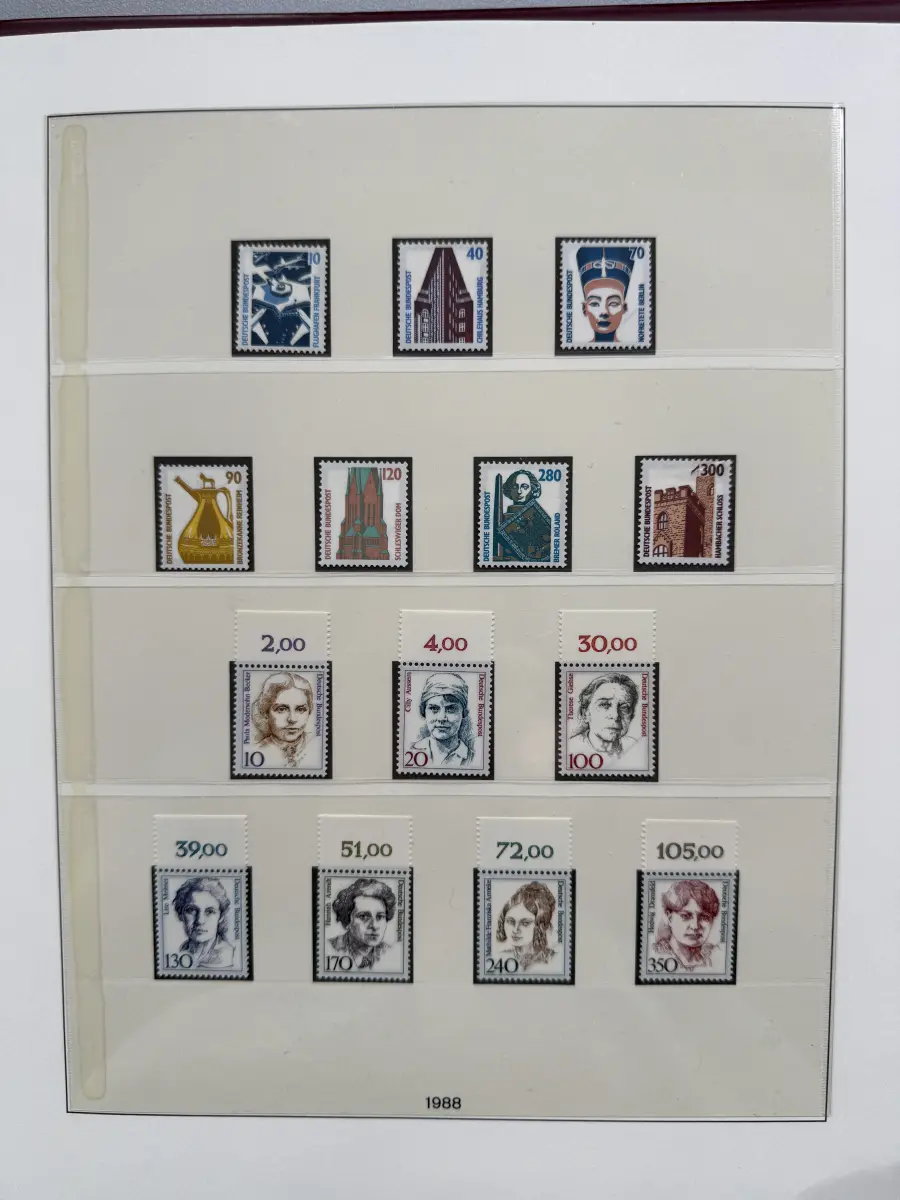 Die Ausgaben der Deutschen Bundespost von 1959-1999 aus Sammlernachlass postfrisch vier LINDNER-Vordruckringbindern auf über 200 Lindner-T-Vordruckblättern (1949-2000) in allen Hauptnummern nach MICHEL augenscheinlich komplett. Vor 1959 sind auch noch einige Marken vorhanden, der Jahrgang 2000 in DM-Währung ist ebenfalls eingefügt. Auch die Block-Einzelmarken sind offensichtlich alle enthalten, dazu noch C/D Werte, ATM, Letterset, Bogenränder etc. sind vorhanden. Der Neupreis für die Vordruckblätter alleine liegt bereits bei weit über 500 Euro, Ringbinder unberechnet. Dazu kommen dann noch die 41 Briefmarken-Jahrgänge.