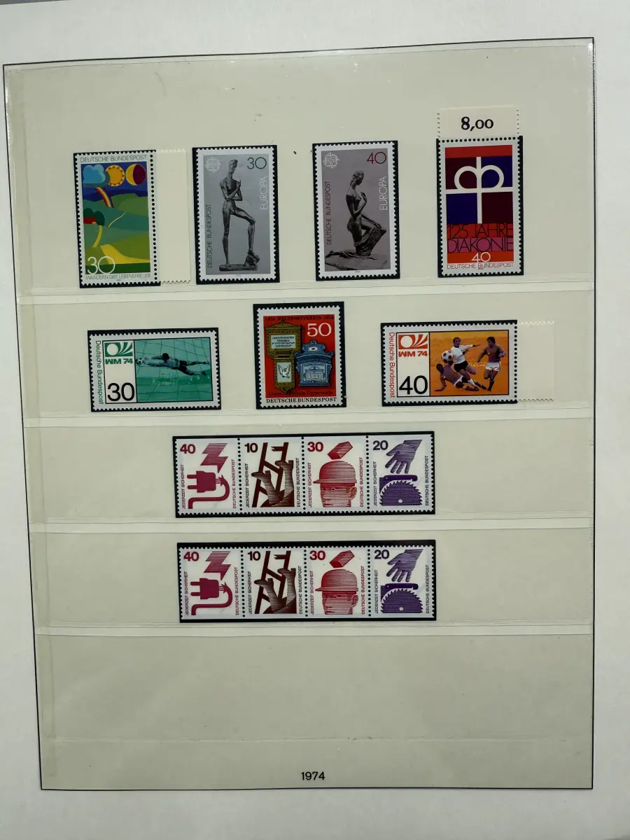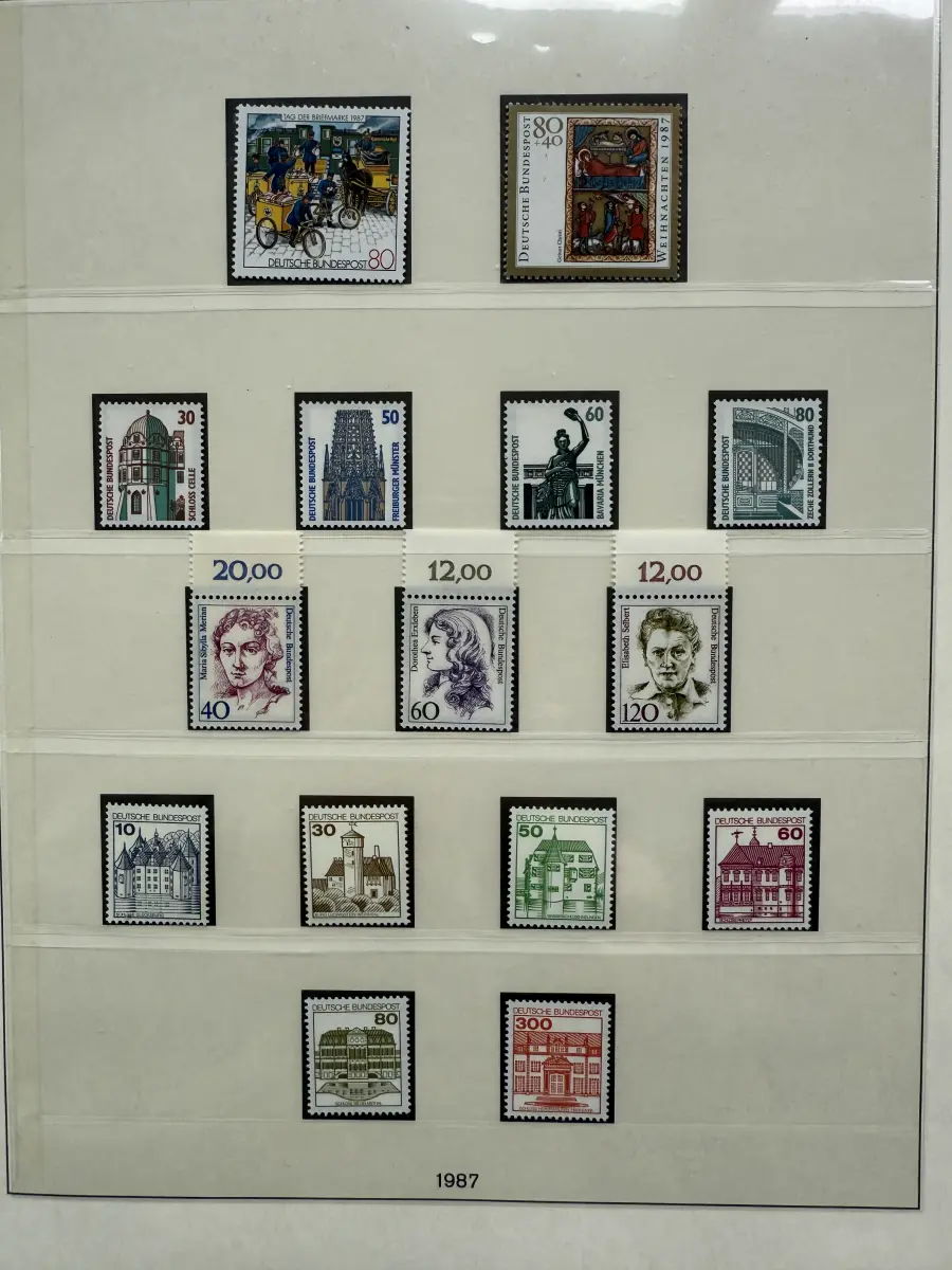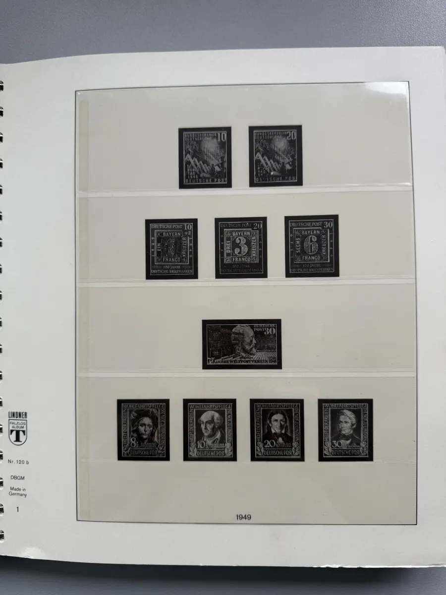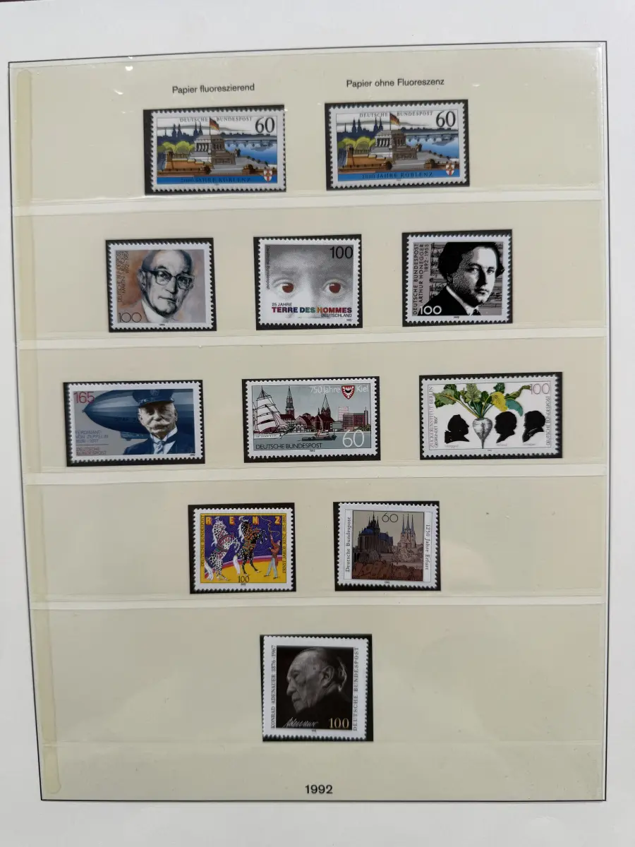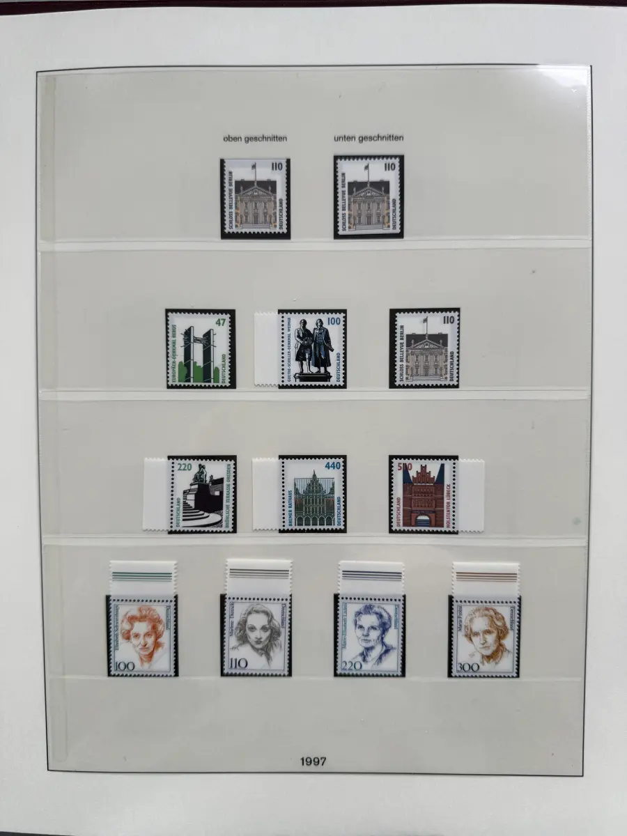 Die Ausgaben der Deutschen Bundespost von 1959-1999 aus Sammlernachlass postfrisch vier LINDNER-Vordruckringbindern auf über 200 Lindner-T-Vordruckblättern (1949-2000) in allen Hauptnummern nach MICHEL augenscheinlich komplett. Vor 1959 sind auch noch einige Marken vorhanden, der Jahrgang 2000 in DM-Währung ist ebenfalls eingefügt. Auch die Block-Einzelmarken sind offensichtlich alle enthalten, dazu noch C/D Werte, ATM, Letterset, Bogenränder etc. sind vorhanden. Der Neupreis für die Vordruckblätter alleine liegt bereits bei weit über 500 Euro, Ringbinder unberechnet. Dazu kommen dann noch die 41 Briefmarken-Jahrgänge.