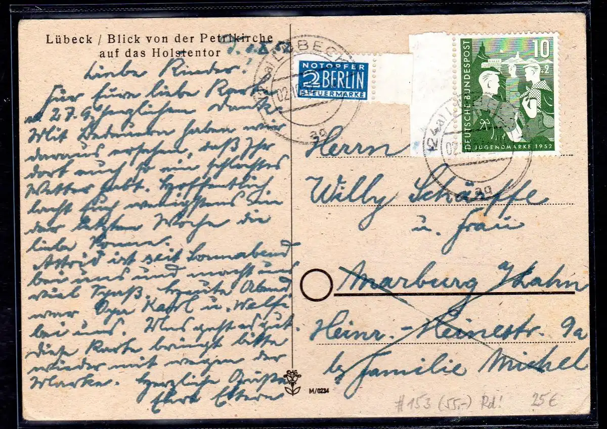 Bund, EF Mi.-Nr. 153 (10 Pfg. Jugend) auf Fern-Karte.