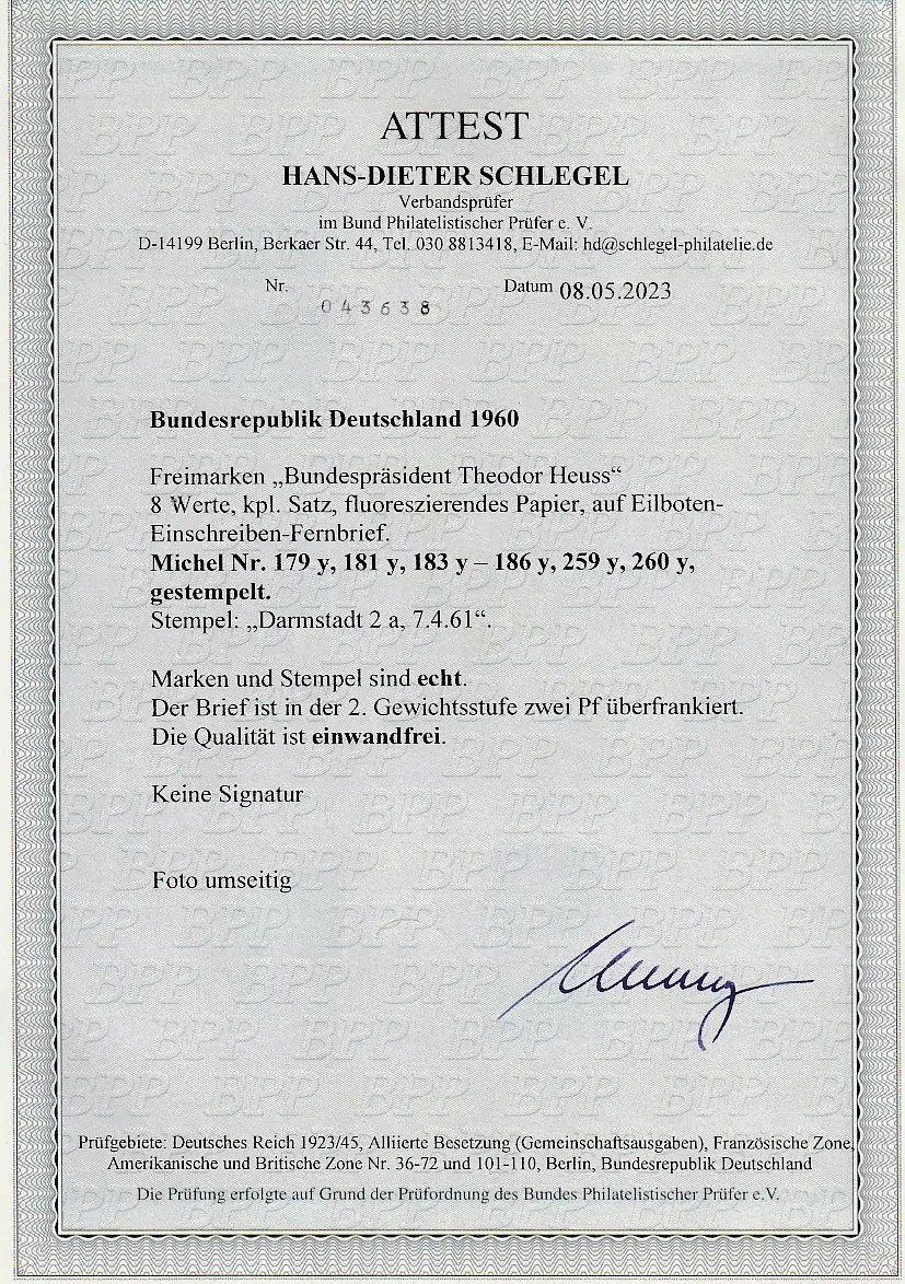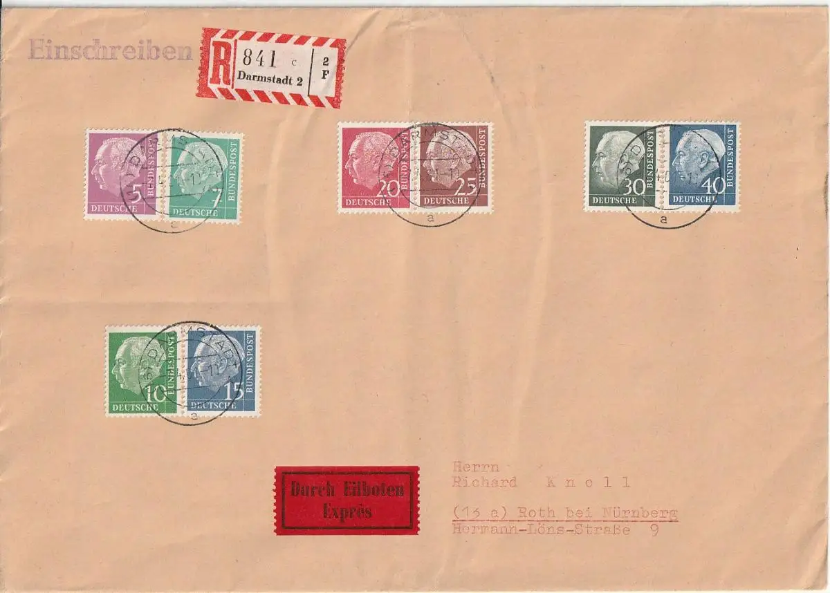 Bund Heuß fluoreszierend auf R-Eilbotenbrief, Attest