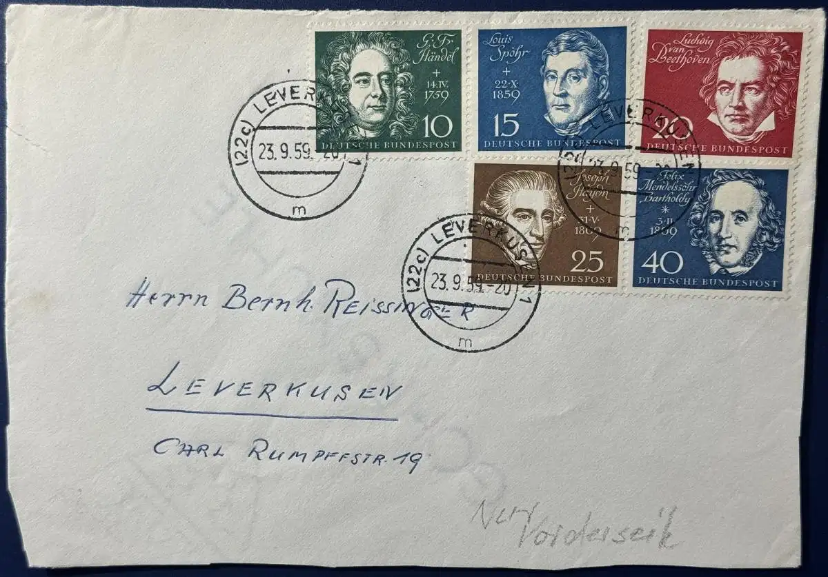 Briefvorderseite, Bund, Mischfrankatur, bestehend aus Mi.Nr. 315, 316 (zusammenhängend), 317 (Einzelmarke) und 318, 319 (zusammenhängend), alle Marken aus dem Beethoven Block, gelaufen mit Poststempel vom 23.09.1959 in Leverkusen.