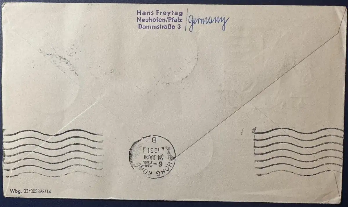 Brief, Bund, Eröffnungsflug Hongkong LH 640/647, Mischfrankatur, bestehend aus Berlin, Mi.Nr. 193-196 und 3x Mi.Nr. 140 (senkrechter Streifen) gelaufen mit Poststempel vom 23.01.1961 von Frankfurt nach Honkong.