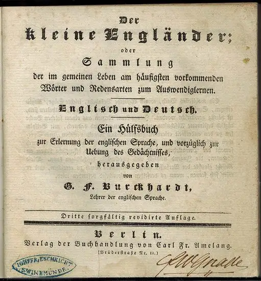 Burckhardt, George Ferdinand (Hg.): Der kleine Engländer; oder Sammlung der im gemeinen Leben am häufigsten vorkommenden Wörter und Redensarten zum Auswendiglernen. Englisch und Deutsch. Ein Hülfsbuch zur Erlernung der englischen Sprache, und vorzüglich z