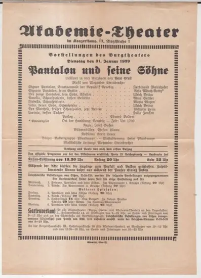Burgtheater Wien. - Akademie-Theater im Konzerthaus, III,. Lisztstraße 1. - Paul Ernst. - Alexander Steinbrecher: Programmzettel zu: Pantalon und seine Söhne. Dienstag den 31. Januar 1939, Vorstellungen des Burgtheaters. - Lustspiel in drei Aufzügen von P