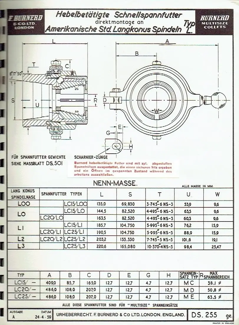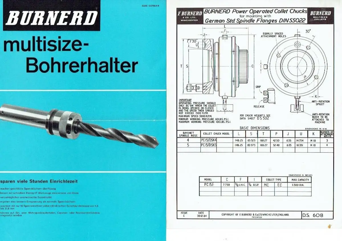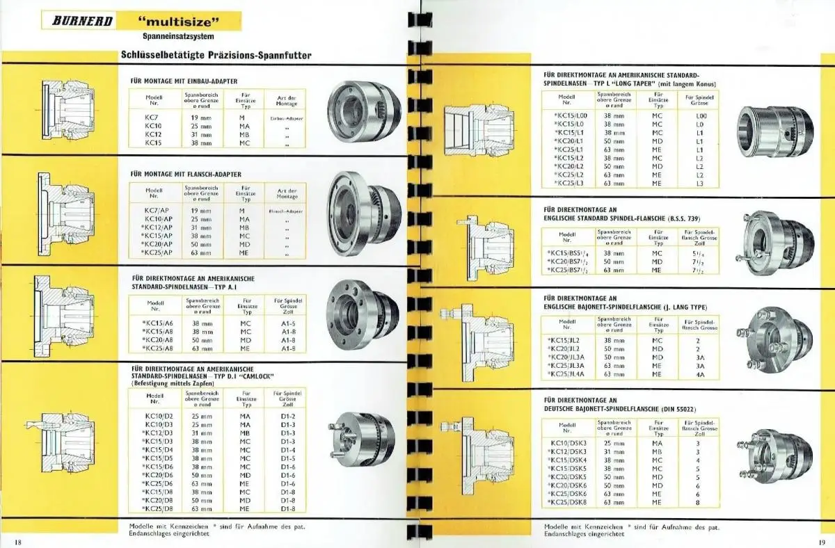 guter bis sehr guter Zustand, geringe Gebrauchs- und Alterungsspuren: Umschlag teils etwas abgenutzt und an den Ecken geknickt - Prospektbeilage gefalten, die Prospektbeilage ist von 1965, die Patenttafeln sind auf 1959 datiert, die Firmenschrift wird irgendwann dazwischen erschienen sein - WARUM MIT "multisize" VEREINHEITLICHEN? - PRINZIP DES "multisize" SYSTEMS - AUSWECHSELBARKEIT DURCH VEREINHEITLICHUNG - HOHE ZENTRIERGENAUIGKEIT - BURNERD "multisize" SPANNEINSÄTZE - Zehn Hauptmerkmale - Für Rundmaterial - Für Vierkantmaterial - Für Sechskantmaterial - Parallelspannung — Erläuterungen - HEBELBETÄTIGTE "multisize" SCHNELLSPANNFUTTER - Einführung - Für Montage mit eingefügtem Verbindungsstück (Einbau-Adapter) - Für Montage mit angeflanschtem Verbindungsstück (Flansch-Adapter) - Für Direktmontage an amerikanische Standard-Spindeln - Für Direktmontage an englische Standard-Spindeln - Für Direktmontage an deutsche Standard-Spindeln - SCULÜSSELBETÄTIGTE "multisize" PRÄZISIONS-SPANNFUTTER - Einführung - Für Montage mit eingefügtem Verbindungsstück (Einbau-Adapter) - Für Montage mit angeflanschtem Verbindungsstück (Flansch-Adapter) - Für Direktmontage an amerikanische Standard-Spindeln - Für Direktmontage an englische Standard-Spindeln - Für Direktmontage an deutsche Standard-Spindeln - Für Direktmontage auf horizontale Aufspanntische - VERTIKALSPANNFUTTER - Einführung - Schlüsselbetätigt - Hebelbetätigt - "multisize" WERKZEUGHALTER - Einführung - Einführung (Fortsetzung) - Nähere Einzelheiten - WANDLERSÄTZE ZUM ANPASSEN VORHANDENER EINRICHTUNGEN - Einführung - Für HERBERT Stangenspannfutter - Für WARD Stangenspannfutter, kartoniert in Spiralbindung, ca. 21 x 28, 26 Seiten mit zahlreichen Bildern + 21 Patenttafeln + 12 Tafelbeilagen + 1 beiliegender Prospekt von 1965