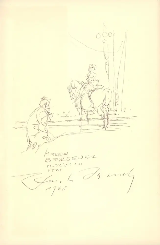Der Maler u. Illustrator W. M. Busch (1908-1987) wurde anläßlich seines 60. Geburtstags mit dem "Saltarino-Preis" geehrt, dem Kulturpreis des deutschen Circus, als Würdigung seiner großen Verdienste, den Circus durch sein künstlerisches Schaffen in Büchern, Illustrierten u. Zeitungen lebendig zu erhalten, als Anerkennung für liebevolle, milieugerechte Darstellung von Menschen u. Tieren... (Klappentext). - Vorsatz mit EIGENHÄNDIGER ZEICHNUNG (dummer August kniet in der Manege vor der schönen Kunstreiterin und ihrem edlen Pferd nieder) UND WIDMUNG von Wilhelm M. Busch. - SU leicht gebräunt. - Gutes, sauberes Exemplar