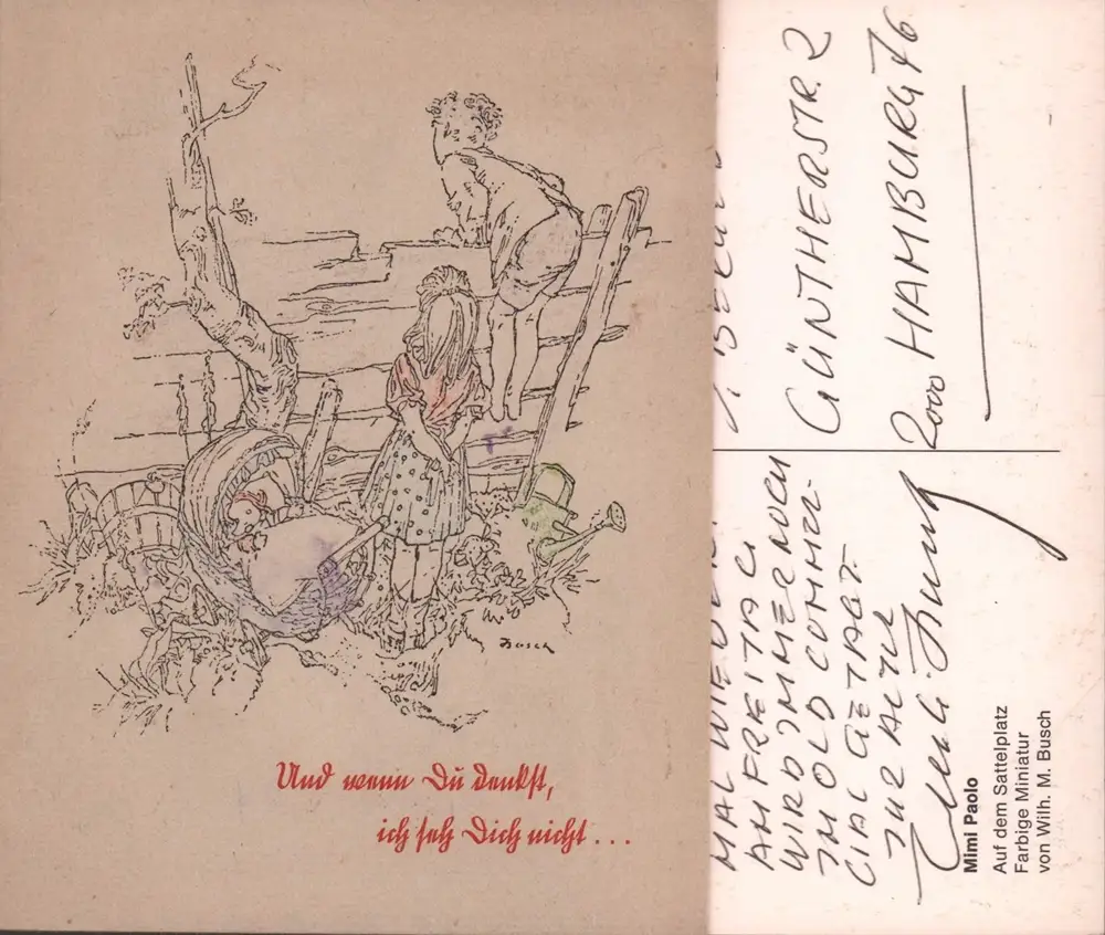 Erste Ausgabe. - Bezauberndes Büchlein mit Suchbildern, die Wilhelm M. Busch für seine Kinder Thomas, Reinhold und Annettchen schuf. - BEIGABE: Eigenhändig beschriebene und unterzeichnete Kunstpostkarte (Post-Stempel unleserlich) mit Neujahrsgrüßen von Wilhelm M. Busch an einen Hamburger Sammler und Freund. - Wenig gebräunt, zwei Bilder zart ankoloriert. - Selten!