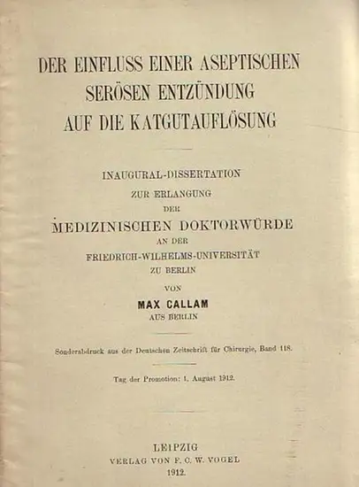 Callam, Max: Der Einfluss einer aseptischen serösen Entzündung auf die Katgutauflösung. Dissertation an der Friedrich-Wilhelms-Universität zu Berlin, 1912. Sonderabdruck aus der 'Deutschen Zeitschrift für Chirurgie', Band 118.