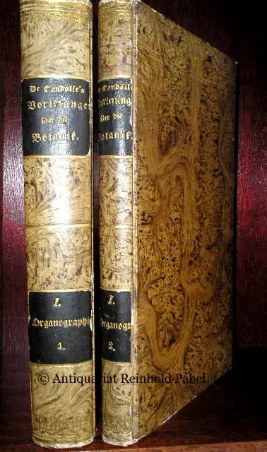 OHNE die 60 Lithotaf., die in diesem Fall vermutl. separat gebunden wurden. - Kanten berieben, StaV., sonst gutes Exemplar. - Augustin Pyrame de Candolle (1778-1841), schweizerischer Botaniker, erhielt 1816 in Genf, wo für ihn ein botanischer Garten gegründet wurde, eine Professur für Naturgeschichte. Er richtete ein Herbarium mit über 70.000 Arten ein u. arbeitete hauptsächlich als Morphologe u. Systematiker, aber auch als Pflanzenphysiologe u. Pflanzengeograph. - C. F. Meisner war Prof. der Physiologie u. Pathologie an der Universität zu Basel u. Mitglied der allgemeinen schweizerischen Gesellschaft für die Naturwissenschaften. - Enthält: Von den Elementar-Organen der Gewächse / Von den Fundamental-Organen, oder von den zur Ernährung wesentlichen organischen Theilen / Von den Reproductions-Organen / Von den accessorischen Organen, oder von den Abänderungen der Fundamental-Organe, durch welche diese ... zu anderen Verrichtungen geeignet werden