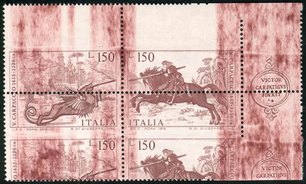 Carpaccio doppelte Sorte Vollgummi - Carpaccio Nr. 1340/1341 zwei Serien, vertikal paarweise mit stark vertikal verschobener und unvollständiger Verzahnung im rechten Teil (Anhang) - weist auch einen starken Farbstreifen auf - auffällige Cod. 787/13