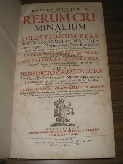 Titel: Practica Nova Imperialis Saxonica Rerum Criminalium in partes III diuisa autore Benedicto Carpzoui (gest. Titel) / Practicae Novae Imperialis Saxonicae Rerum Criminalium pars I , II et III, quaestionum fere universarum in materia cuiusque generis homicidiorum, fractae pacis publicae, laesae Majestatis, tum humanae, quam divinae Falsificationis Monetarum, Blasphemiarum, Perjurii et Sortilegiorum, Ex jure civili Romano, Imperiali, Saxonico, Ordinat. & Constitut. electoral. Decisiones absolutas, Responsis Scabinorum Lipsiensium approbatas et usu ac observantia Fori Saxonici confirmatas, exhibens