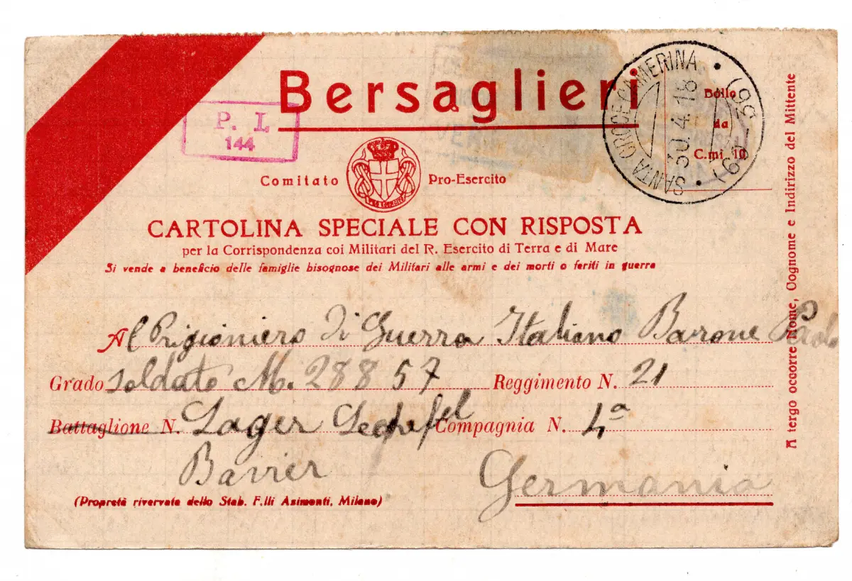 - Patentierte Sonderkarte Bersaglieri zugunsten von Militärfamilien verkauft; am 30.4.18 frankiert nach Deutschland gereist - Zensuraufhebung beiseite - Ungewöhnliche Nr. 60/L