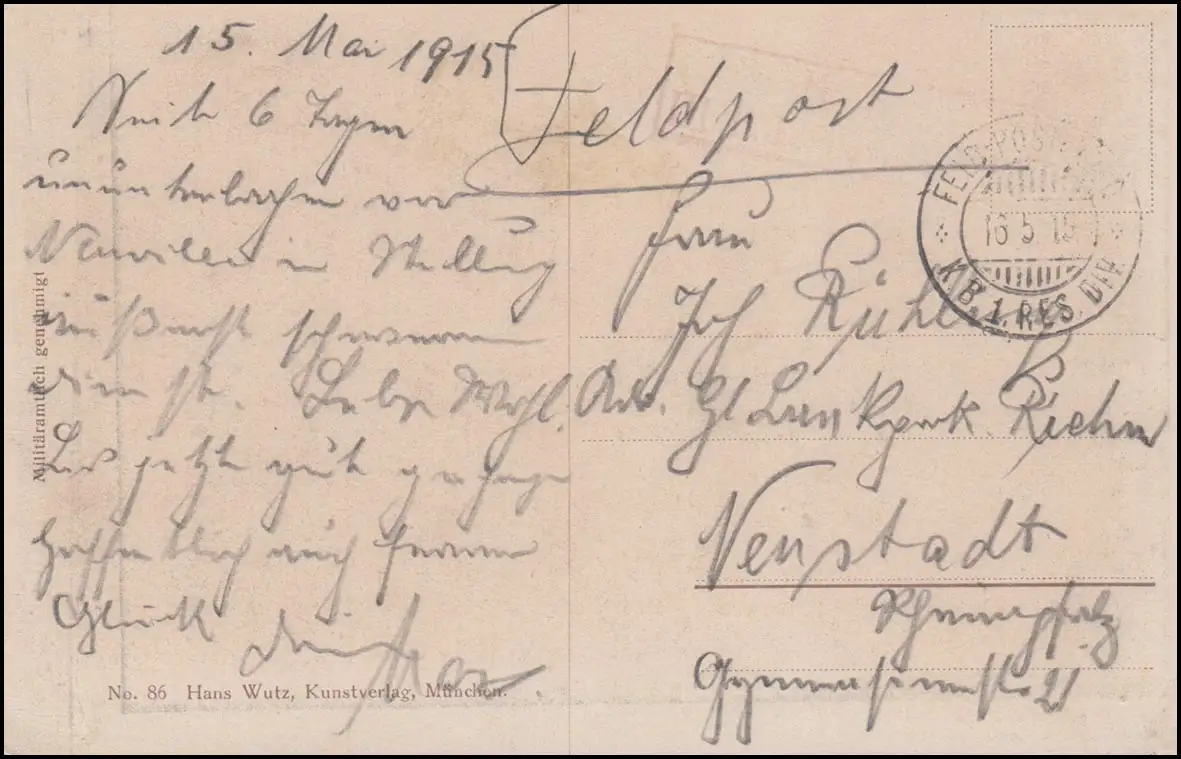 Carte postale de terrain K.B. 1. Res.-Div. 16.5.1915 sur tableau-AK Empereur Franz Josef I.
