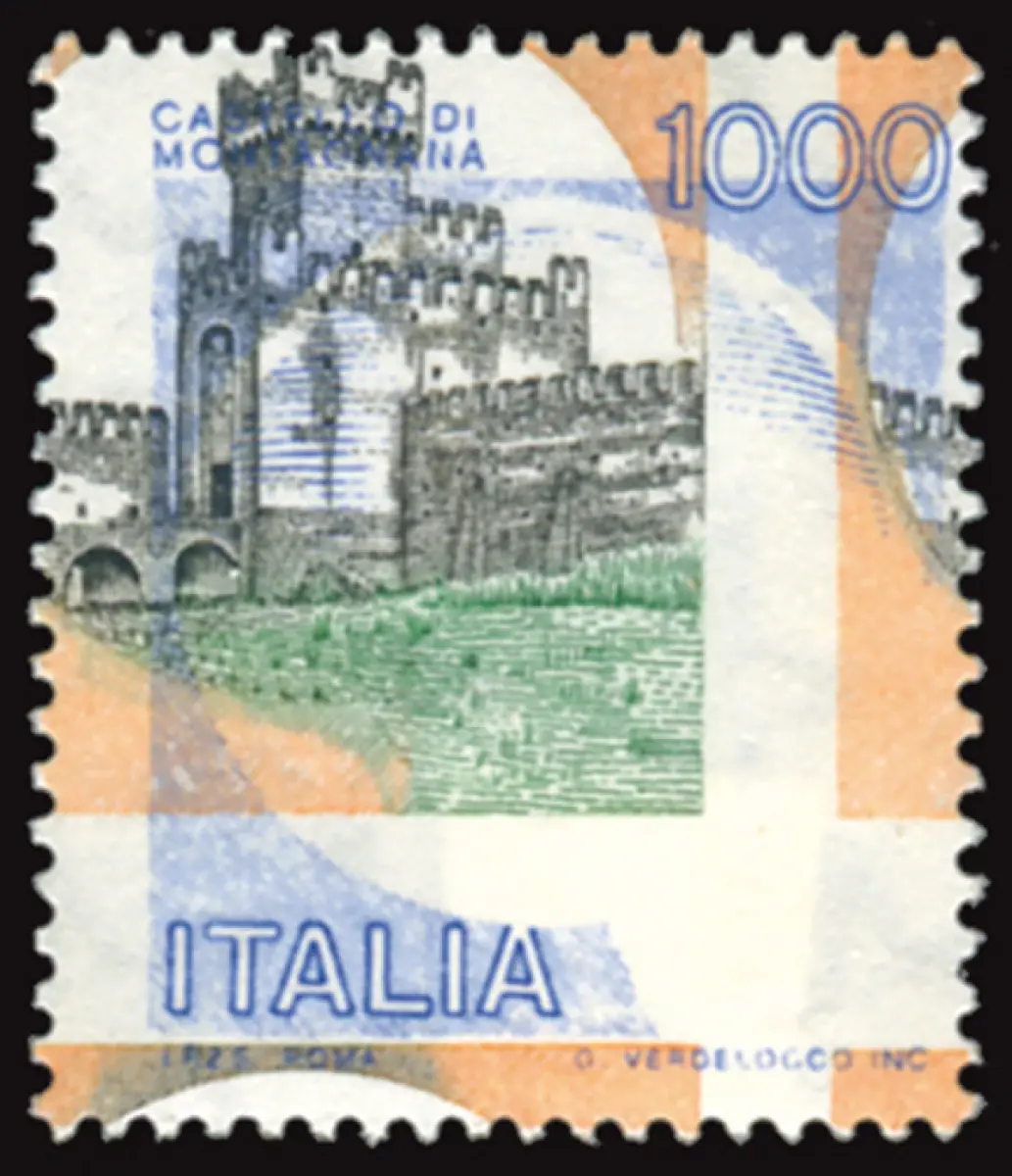 Castelli Lire 1.000 Druckvarianten der Farben des Zentrums Vollgummi MNH - Castelli Lire 1.000 Nr. 1527 Druck der Farben der Mitte, Orange, Grün und Schwarz stark in beide Richtungen verschoben - auffällig Cod. 663/16