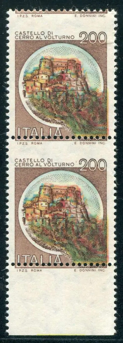 Castelli Lire 200 Sortenpaar I.P.Z.S. - Rom oben statt unten Vollgummi - Castelli Lire 200 Nr. 1516 vertikales Paar b. von f. unten mit stark verschobener horizontaler Verzahnung - die Aufschrift I.P.Z.S. - Rom oben statt unten - wertvolle Sorte für diesen Rechenwert Code 596/11