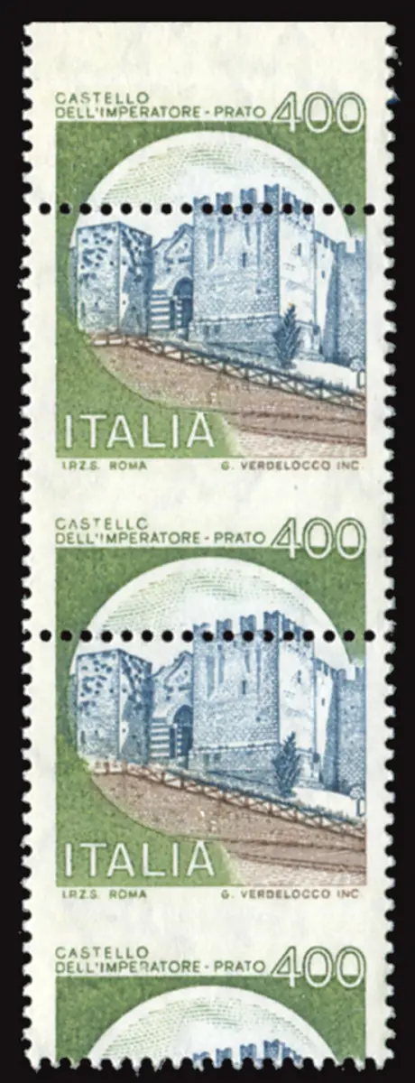 Castelli Lire 400 Sorte doppelter Wert Vollgummi MNH - Castelli Lire 400 Nr. 1520 wunderschönes Paar b. von f. oben mit stark nach unten verschobener horizontaler Verzahnung (Sass. spec. Nr. 1137 Ec) - das obere Exemplar mit dem am Rand wiederholten Schriftzug Kaiserburg 400 - Selten Cod. 600/16