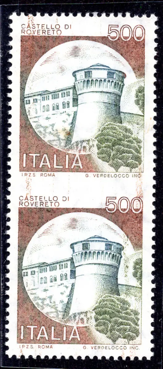 Castelli Lire 500 Sorte vertikales Paar ungezahnt in der Mitte Vollgummi - Castelli Lire 500 Nr. 1522 vertikales Paar ungezähnt in der Mitte (Sass. spec. 1139 EC) - Uncommon - Cod. 843/5