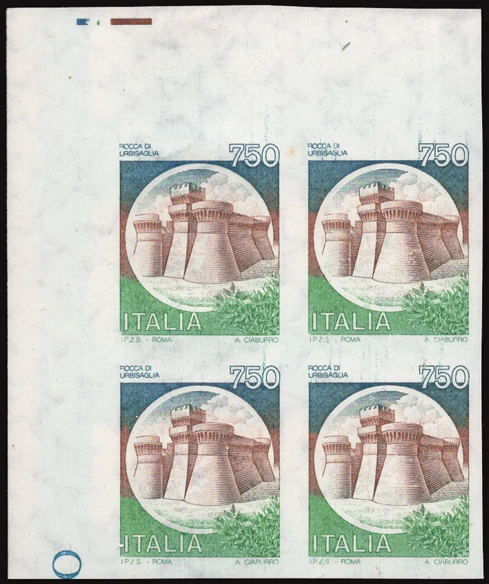MNH - Vollgummi - - Castelli Lire 750 Nr. 1524Ae ungezähntes Viertel a. di f. integral - Selten - Kat. euro 2.600 Cod.733/182
