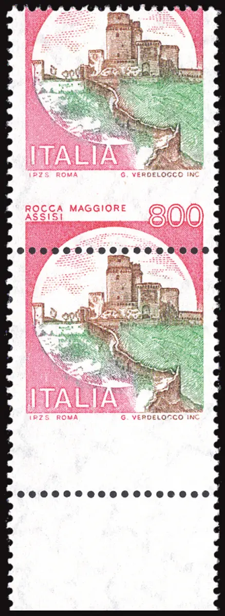MNH - Vollgummi - - Castelli Lire 800 Nr. 1525 vertikales Paar b. von f. unten mit stark nach unten verschobener horizontaler Verzahnung - das untere Exemplar ohne Schlossnamen und Wert - Selten Cod.738/182