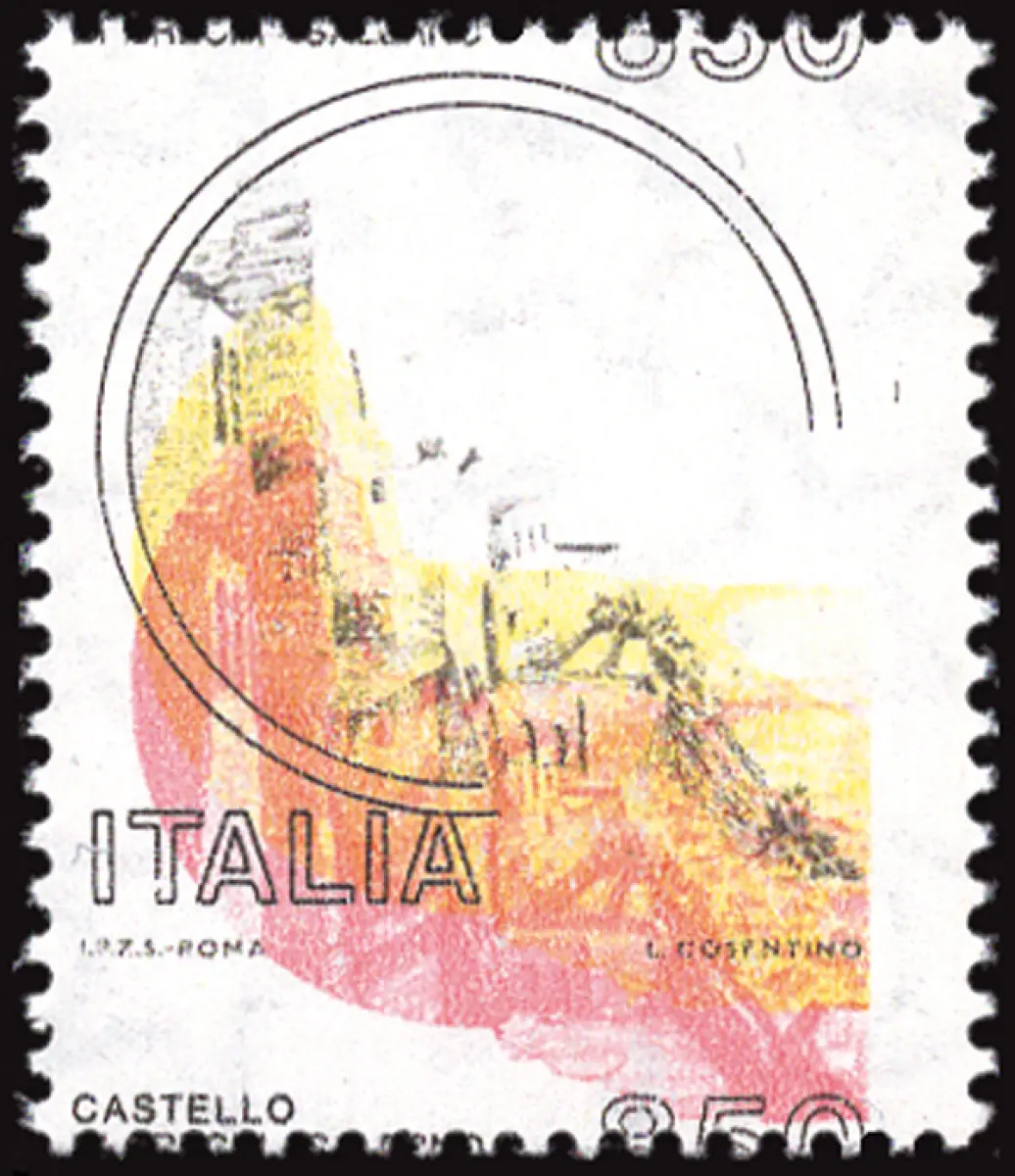 MNH - Vollgummi - - Castelli Lire 850 Nr. 1525A verschobene horizontale Verzahnung, ohne Blaudruck mit stark nach unten verschobenen Farben Rot und Gelb - auffällig Cod.741/182