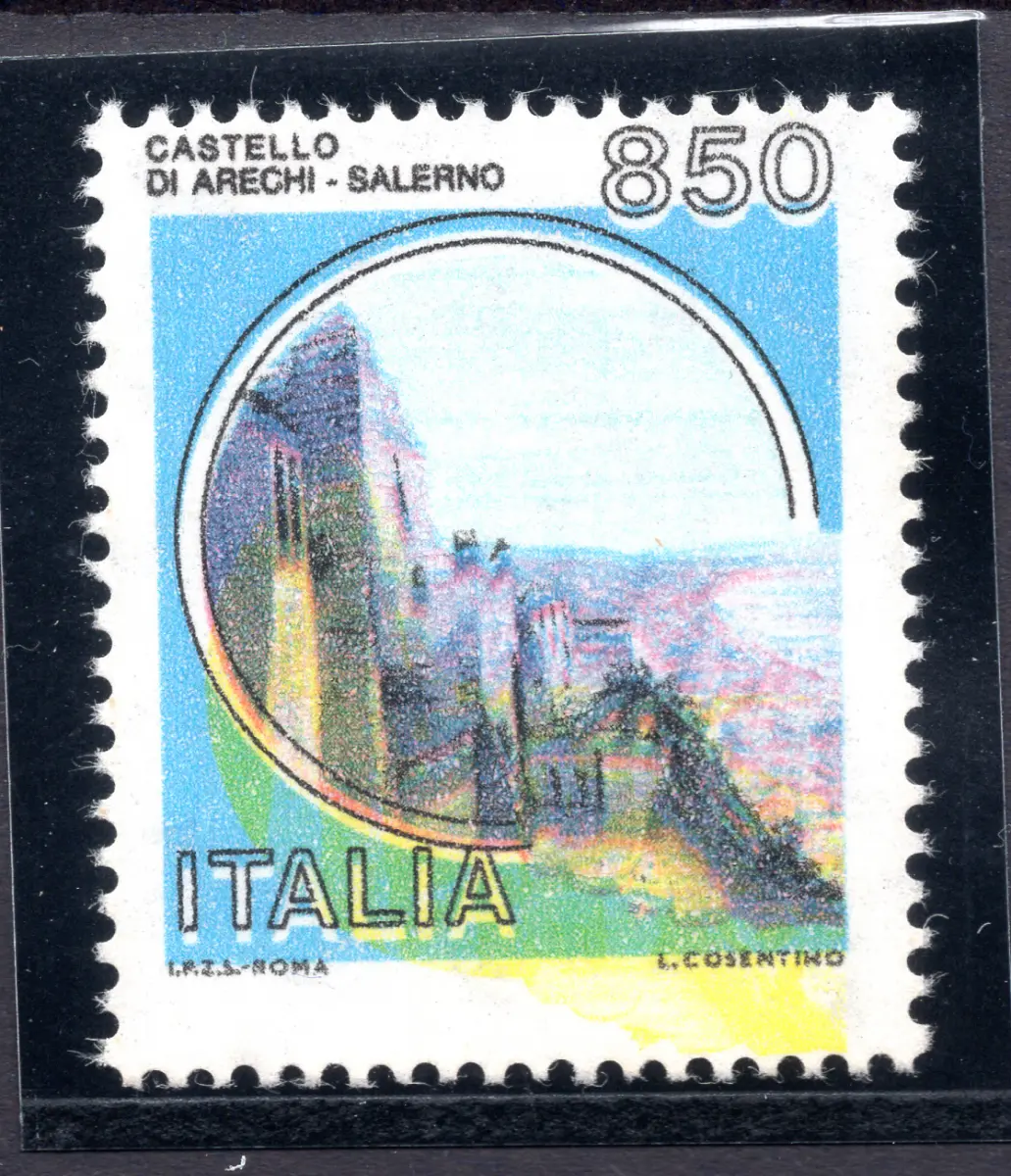 MNH - Vollgummi - - Castelli Lire 850 Nr. 1525A mit stark nach unten versetztem Gelbdruck pro mm. 5, durch Verschiebung erscheint das Schloss rosa - Ungewöhnlich Cod.744/182
