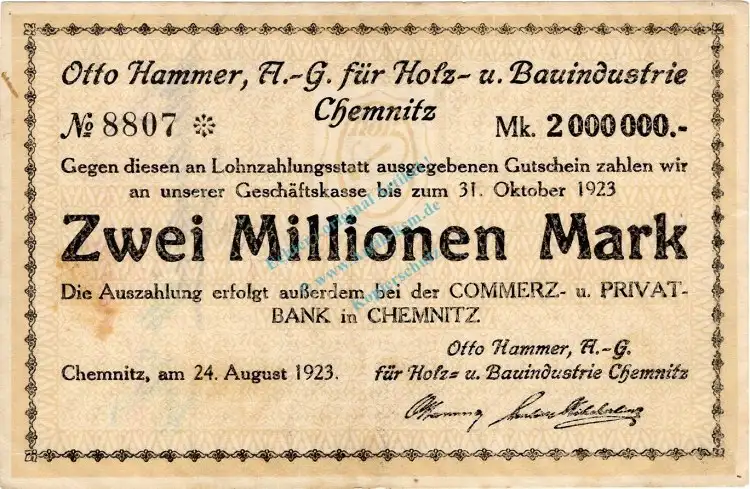 Chemnitz , Banknote 2 Millionen Mark Schein gbr. Bühn 0687.4.b , Sachsen 1923 Inflation